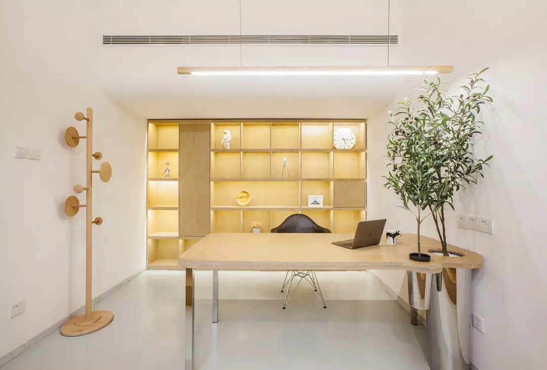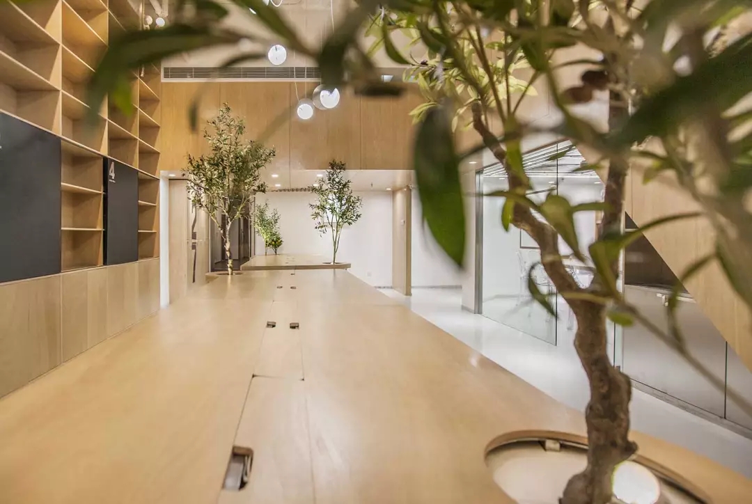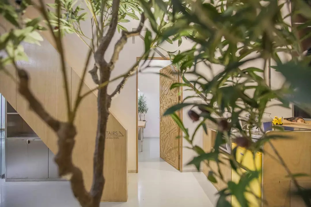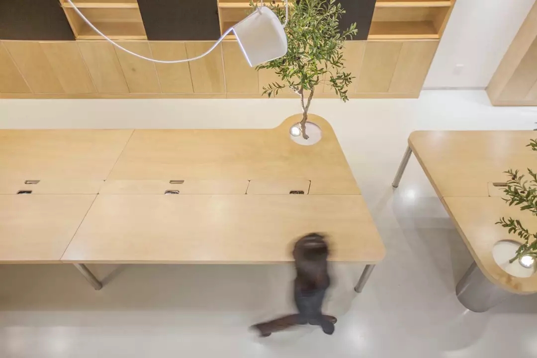 辦公桌與樹的結(jié)合,成為了整個(gè)空間的內(nèi)景觀,也與外面的綠色形成呼應(yīng),消減以往辦公的緊張氛圍。整墻的書架也不甘無(wú)趣,在實(shí)用的框架下,產(chǎn)生一絲波動(dòng)的起伏,如同山崖,如同坡面。