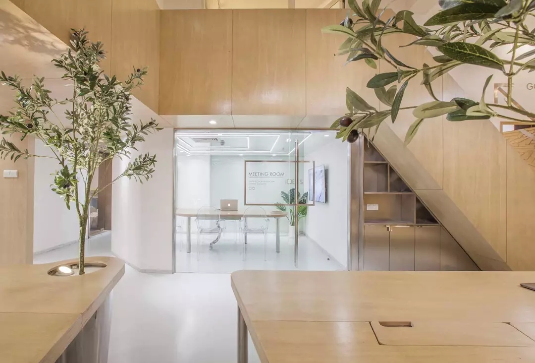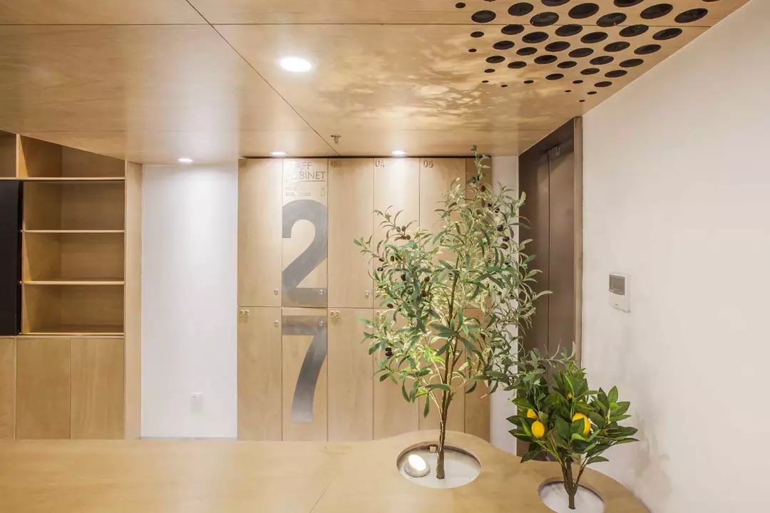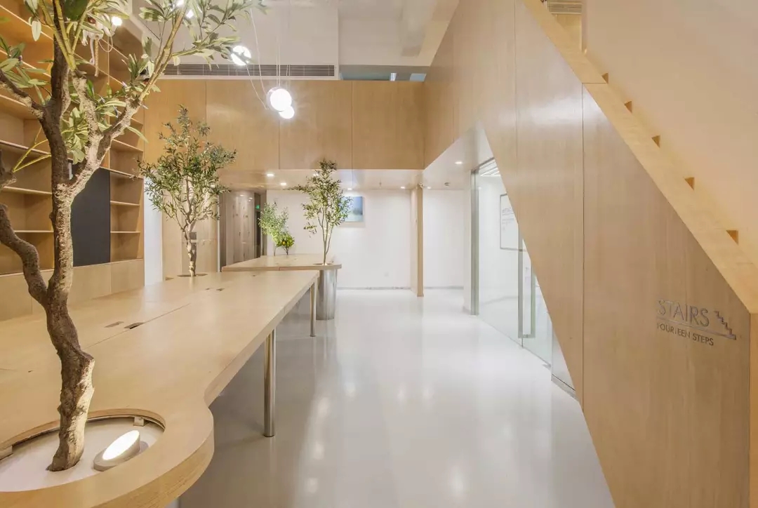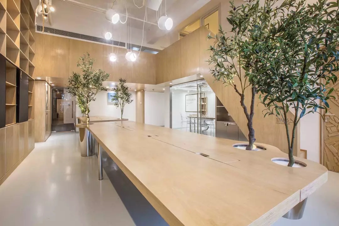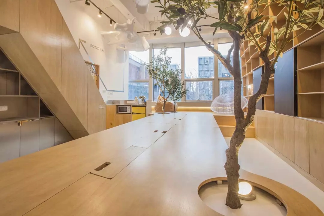 辦公桌與樹的結(jié)合,成為了整個(gè)空間的內(nèi)景觀,也與外面的綠色形成呼應(yīng),消減以往辦公的緊張氛圍。整墻的書架也不甘無(wú)趣,在實(shí)用的框架下,產(chǎn)生一絲波動(dòng)的起伏,如同山崖,如同坡面。