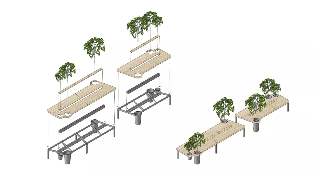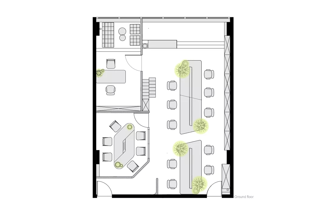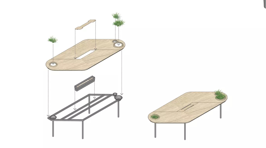 同時(shí)我們希望有一個(gè)張別具一格的會(huì)議桌,但是會(huì)議桌極強(qiáng)的功能性使得難以去進(jìn)行改變。于是,會(huì)議室空間本身的形狀缺陷成了這張桌子想法的起點(diǎn)。由于避讓入口玄關(guān),會(huì)議室空間有一個(gè)角是切掉的,墻壁是斜著放置,如果是長(zhǎng)方形的會(huì)議桌,就必然在這個(gè)斜墻前造成使用空間不夠缺陷,無(wú)法坐人.所以就產(chǎn)生了一個(gè)平行四邊形的會(huì)議桌,斜邊與空間的斜墻平行,也讓整個(gè)斜墻前的空間可以坐下一個(gè)參會(huì)者,再嵌入一些小草,一張獨(dú)特又實(shí)用的會(huì)議桌就出來(lái)了。