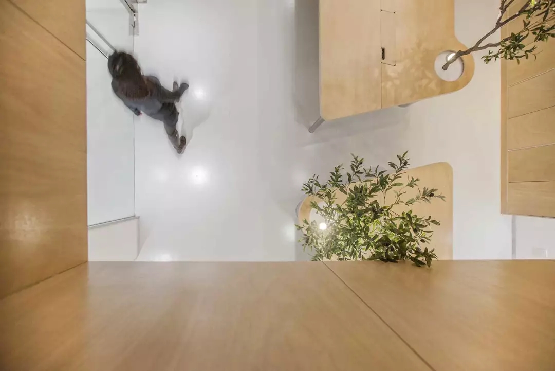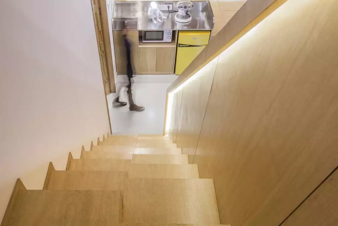 ▲交錯(cuò)的樓梯節(jié)省了樓梯的長(zhǎng)度,避開了頭頂?shù)臋M梁,順帶凹個(gè)造型