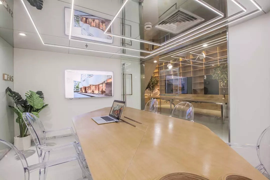 由于層高的限制,會(huì)議室感覺比較壓抑,所以將整個(gè)天花變?yōu)殓R面,化解的層高的局限,也讓空間感別具一格.但是空調(diào)的出風(fēng)散流器非常扎眼,空調(diào)的位置決定了風(fēng)口位置無(wú)法移動(dòng)。而市面上又找不來(lái)合適的可以符號(hào)化的替代品,于是,就順勢(shì)而為,將會(huì)議室的照明以散流器為中心進(jìn)行布置,讓散流器的方框與燈光呼應(yīng)起來(lái),形成了會(huì)議室有意思的圖形。