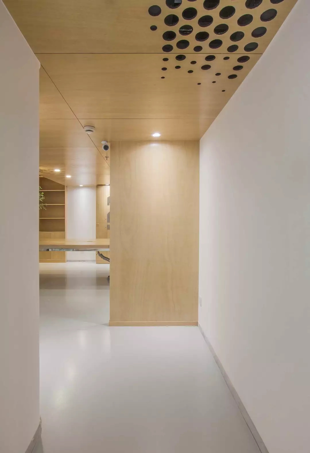 功能融于樂趣與創(chuàng)意,兩個(gè)空調(diào)的回風(fēng)孔也不能放過(guò),市面上的百葉口為了實(shí)用而完全無(wú)法融入環(huán)境。由于吊頂也屬于木質(zhì)體塊,所以經(jīng)過(guò)試驗(yàn),一個(gè)充滿漸變的點(diǎn)陣圖形,解決了這個(gè)問題,不同規(guī)格的開孔器進(jìn)過(guò)精心布置并開洞,讓空間回歸純粹與樂趣。