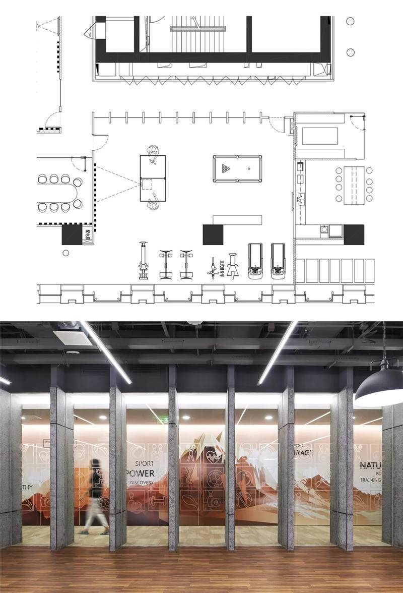 健身房采用的是隔墻類的隔斷,透過隔墻隔斷玻璃能看到核心筒的走道,核心筒的墻面是一幅大型的噴繪畫,結合立體字,畫面比較震撼,再通過健身房往外看就會產(chǎn)生非常豐富的層次感。玻璃隔斷上也有小的磨砂圖案,形成了戲劇性的效果,使空間的層次更加突出。