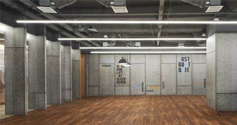 整體空間設計多層次,所以它的貼膜采用黑色字母來呈現(xiàn)健身區(qū)的氛圍。
