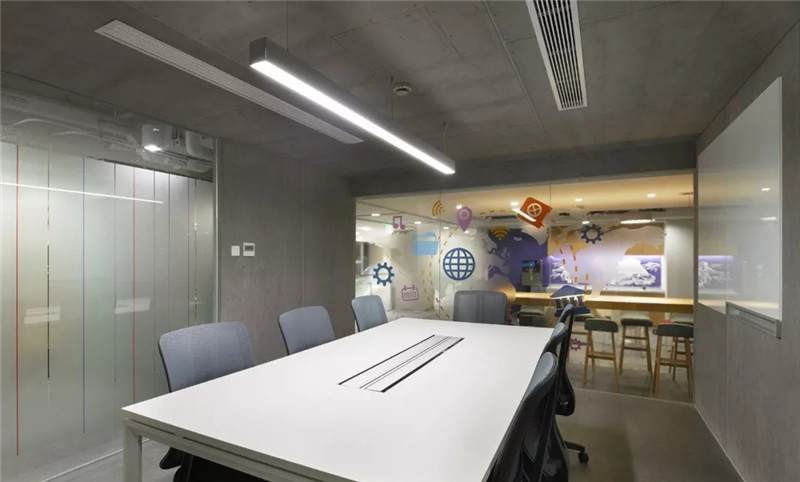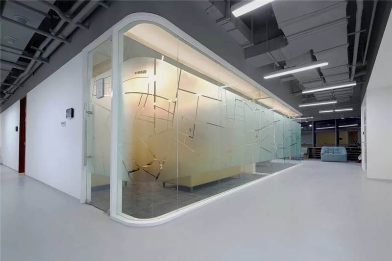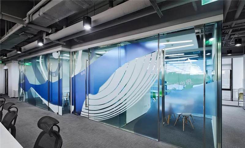 第二張中可以看到,桌上足球,這一張是會議室的玻璃貼膜,最初設計的都是一些彩色的圓點,但是做完后太通透,起不到遮擋作用,所以現(xiàn)場臨時在玻璃的內側又加了大型的磨砂圓,就有兩層疊加到一起的圖形,磨砂與色彩組合在一起,效果豐富有層次。