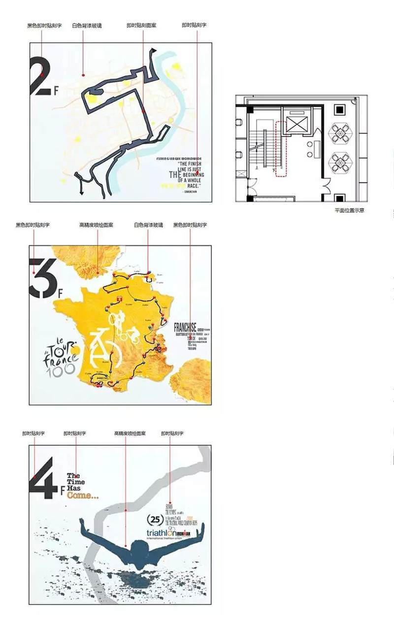 軟裝部分,這是幾層的設計稿,不同樓層的導視結合圖案以及主要的背景墻的主題。當時的設計文件實際的完成效果可以看出跟之前的設計稿基本上是完全一樣的,設計的時候也是因為都是用的矢量文件1:1的設計小稿,所以能保證完成后的效果。