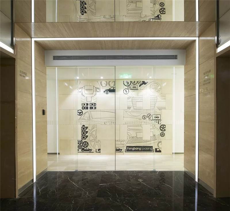 因為項目在北京,所以選取北京有代表性的建筑剪影組合在一起,形成了貼膜圖案。實際實施完以后,燈光打亮的情況下,地圖相當于有不同細度的鏤空線條,非常清晰,包括建筑的剪影也十分細致,既起到了一定的私密性,又有非常強的視覺效果。