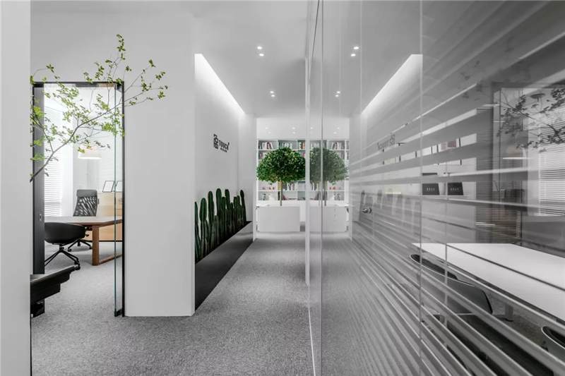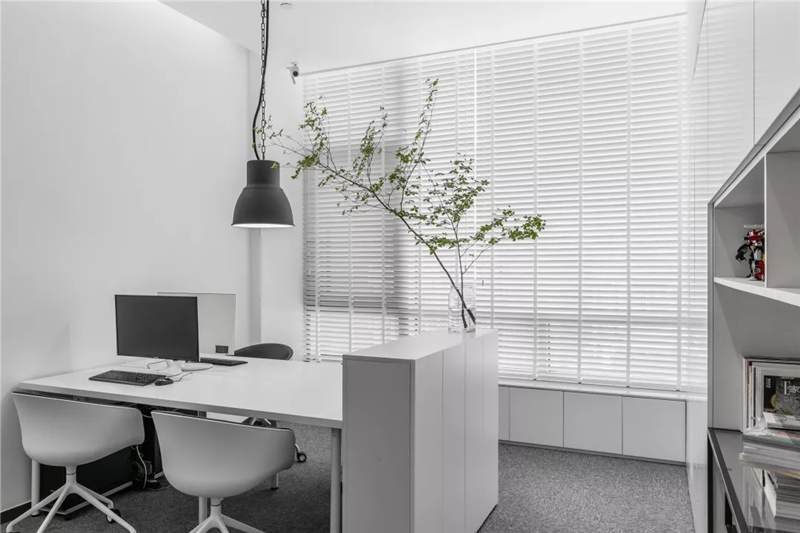 另一側(cè)的空間則增添了二三分私密性。沉穩(wěn)的木質(zhì)案桌上,擺放的綠枝椏仿若思想的觸手,與仙人掌、小株綠植串聯(lián)起空間動(dòng)線。區(qū)域內(nèi)各自獨(dú)立,用玻璃門分隔開,在保證個(gè)人能最大限度沉浸思維創(chuàng)作的同時(shí),又能及時(shí)地與伙伴交流互換,碰撞不同的思想。