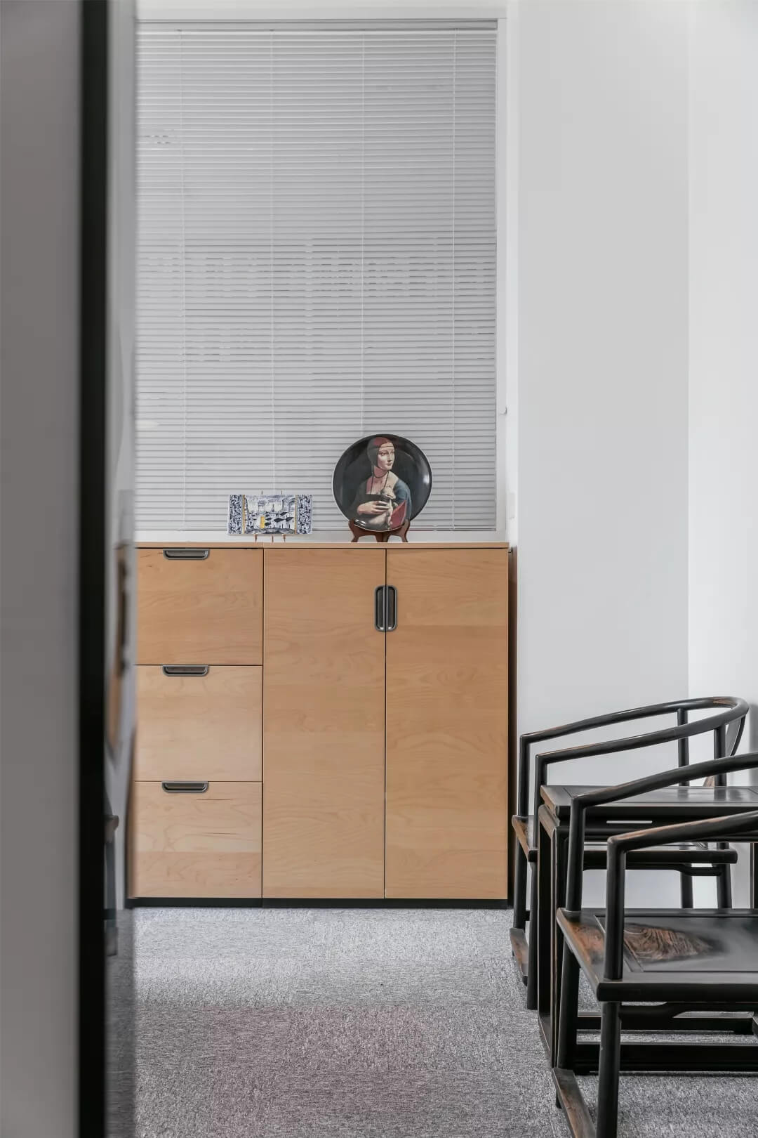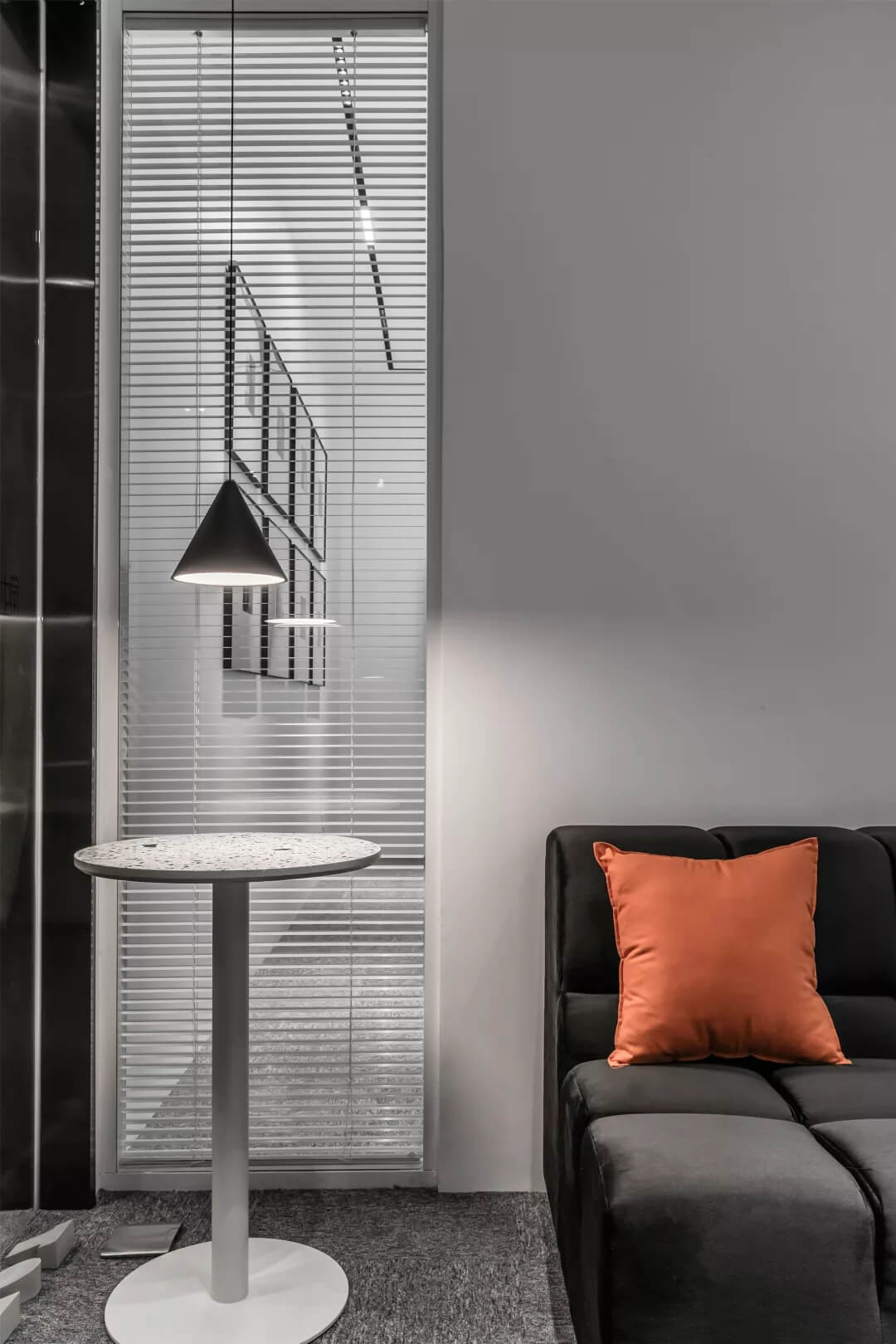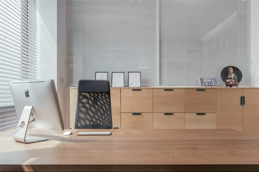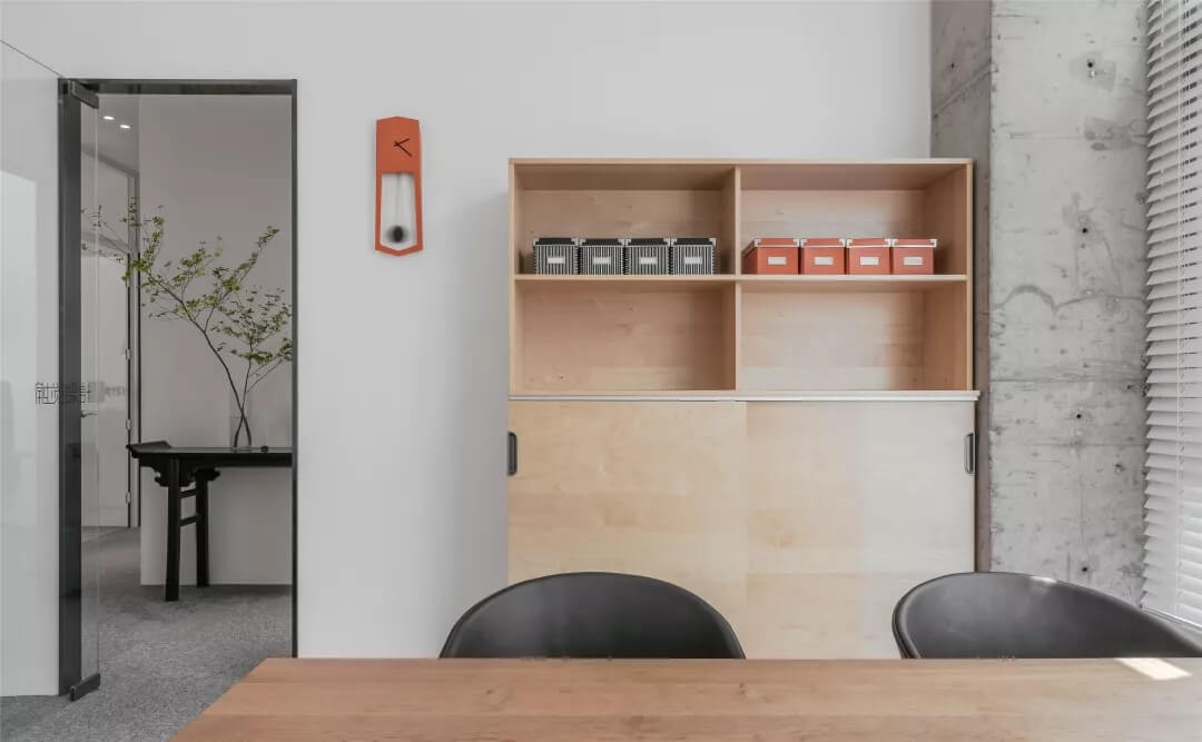 自由無拘的溝通對于團(tuán)隊(duì)的創(chuàng)新至關(guān)重要。開放的辦公區(qū)是有效獲取信息和激發(fā)靈感的地方。百葉窗折射的光影,充足的自然光營造高效的工作環(huán)境。空間雖然有限,但發(fā)揮最大的性能,開辟出一整面的軟裝材料搭配區(qū)。