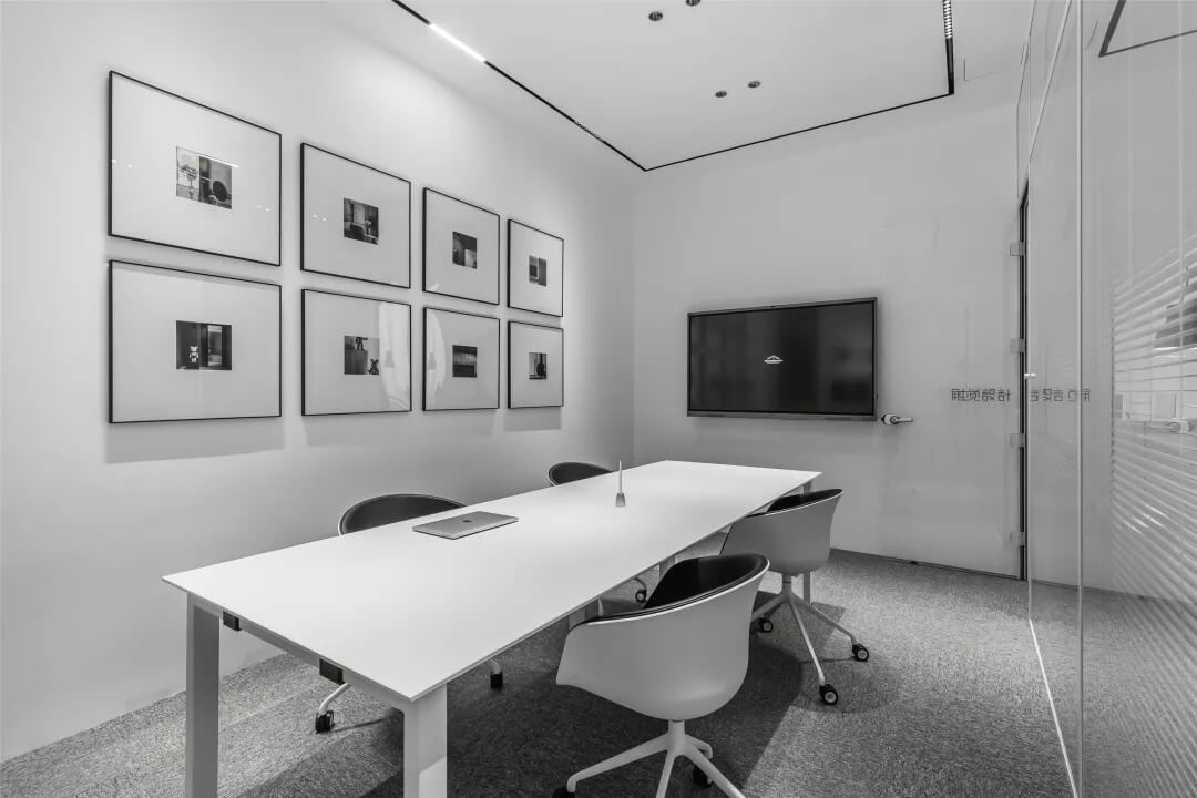 為了同時(shí)保證隱私和透明,張馳有道。會(huì)議室采用了玻璃+百葉窗的設(shè)計(jì),這樣的交流區(qū)域保持彼此的通透與聯(lián)接,提升了場所的張力。使用貼合設(shè)計(jì)的局部掛畫藝術(shù),配以金屬的深邃感官,多媒體影視裝置加強(qiáng)了墻面空間的信息輻射作用。
