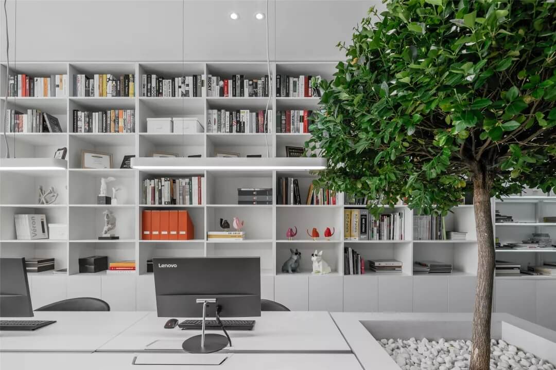 在這里,未知的一切與既有的常識記憶產(chǎn)生傳導(dǎo),想象思維的觸角開始蔓延。小株綠樹分隔出挑高的白色高座式二人桌,提供了一種更為隨性、更利于面對面交流的辦公形式。