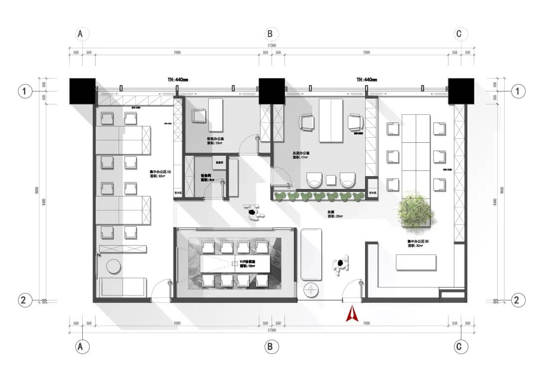 另一側(cè)的空間則增添了二三分私密性。沉穩(wěn)的木質(zhì)案桌上,擺放的綠枝椏仿若思想的觸手,與仙人掌、小株綠植串聯(lián)起空間動(dòng)線。區(qū)域內(nèi)各自獨(dú)立,用玻璃門分隔開,在保證個(gè)人能最大限度沉浸思維創(chuàng)作的同時(shí),又能及時(shí)地與伙伴交流互換,碰撞不同的思想。