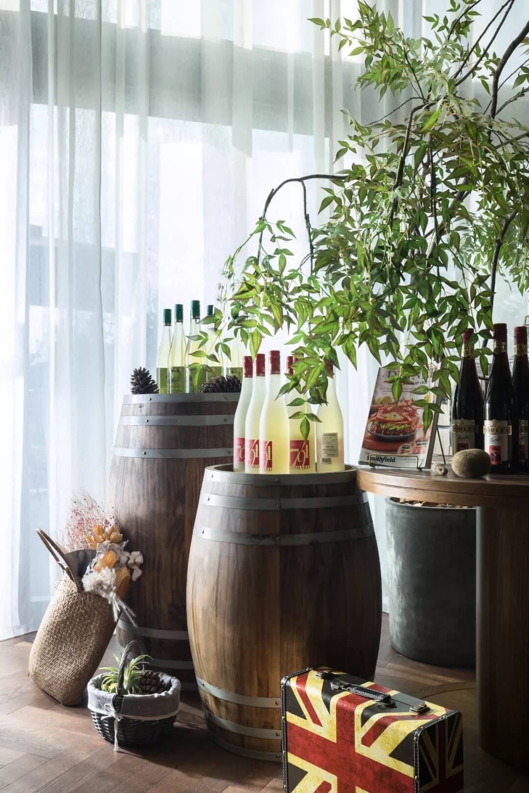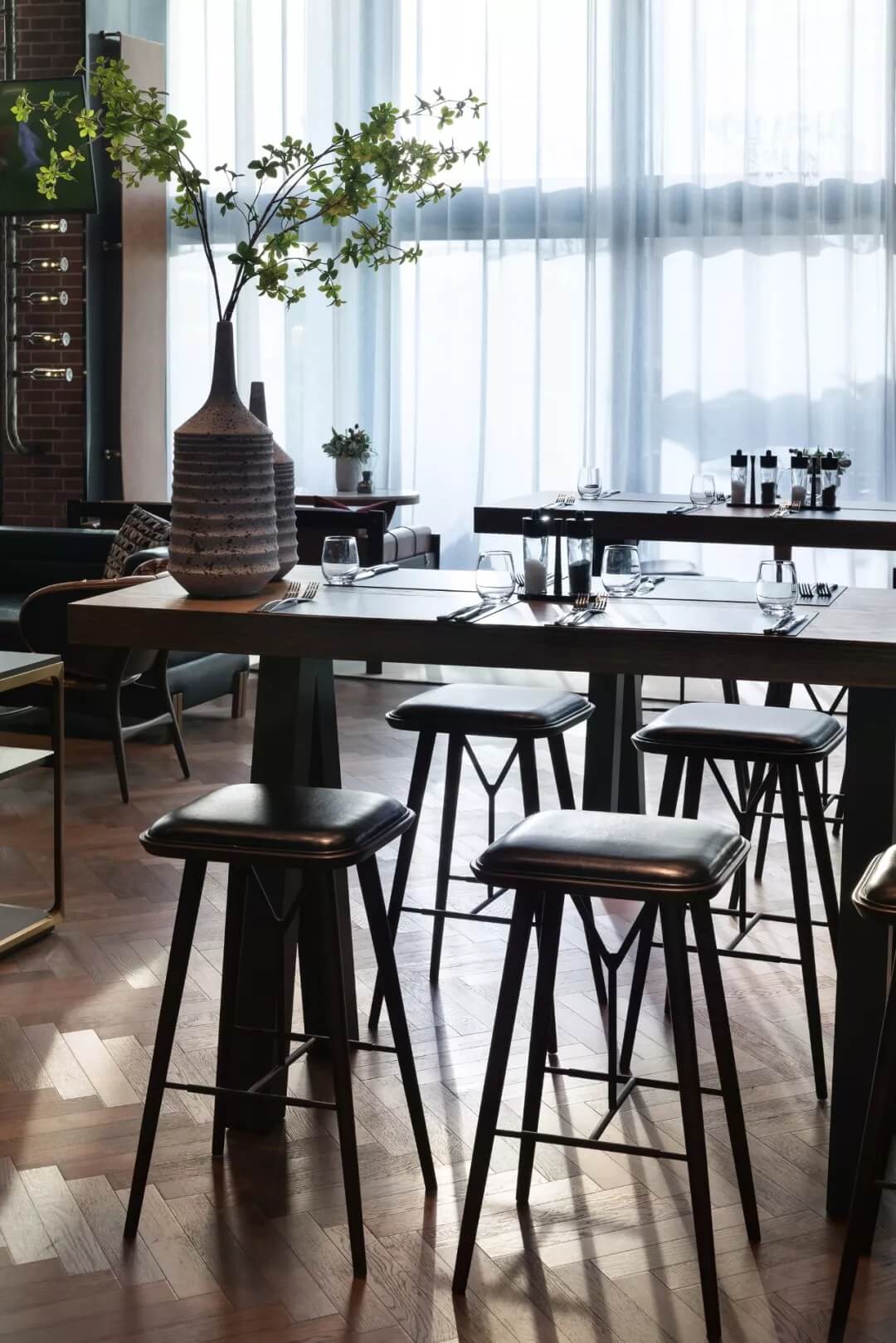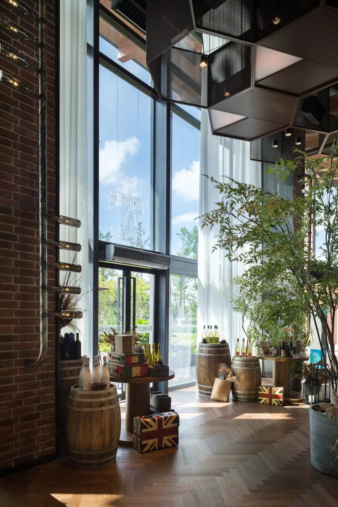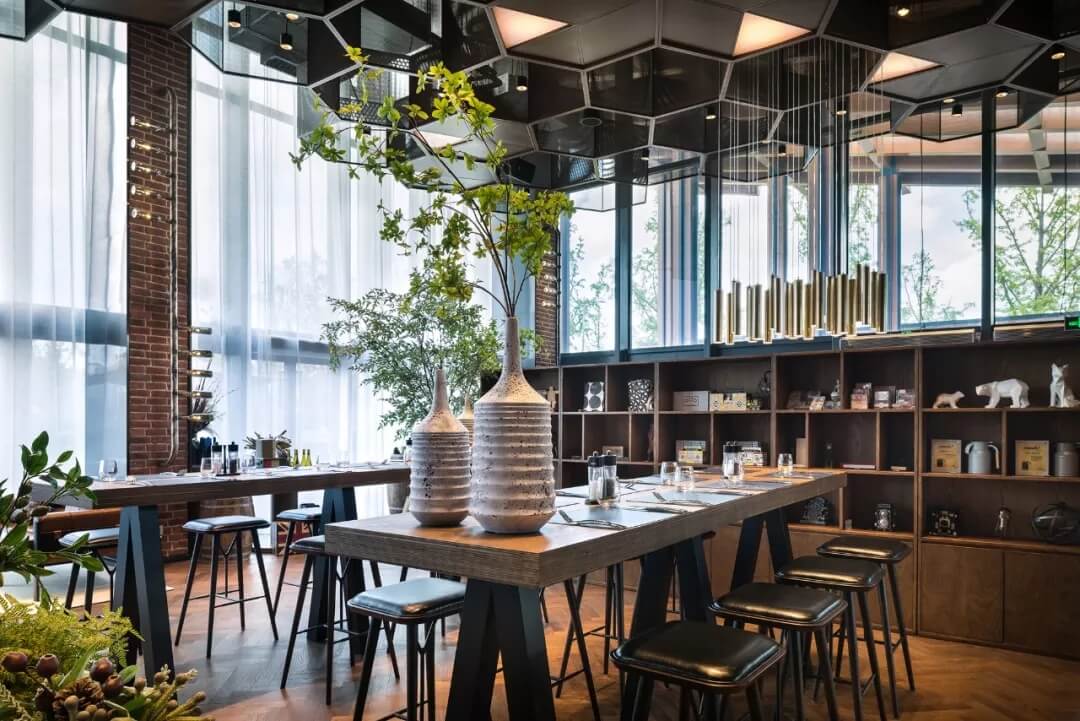 自然的青翠綠意與質樸的啤酒桶木藝氣質互融,靈韻交加,酒香沁人,不加過多修飾地圍合出一隅相對靜謐的臨窗休閑區(qū)。在這里,設計透過落地玻璃窗的相隔將內外視域完全打開,陽光傾灑進來,引入截然不同的清新與濃密的自然舒適度,外在景觀與內在布設氣質相合。