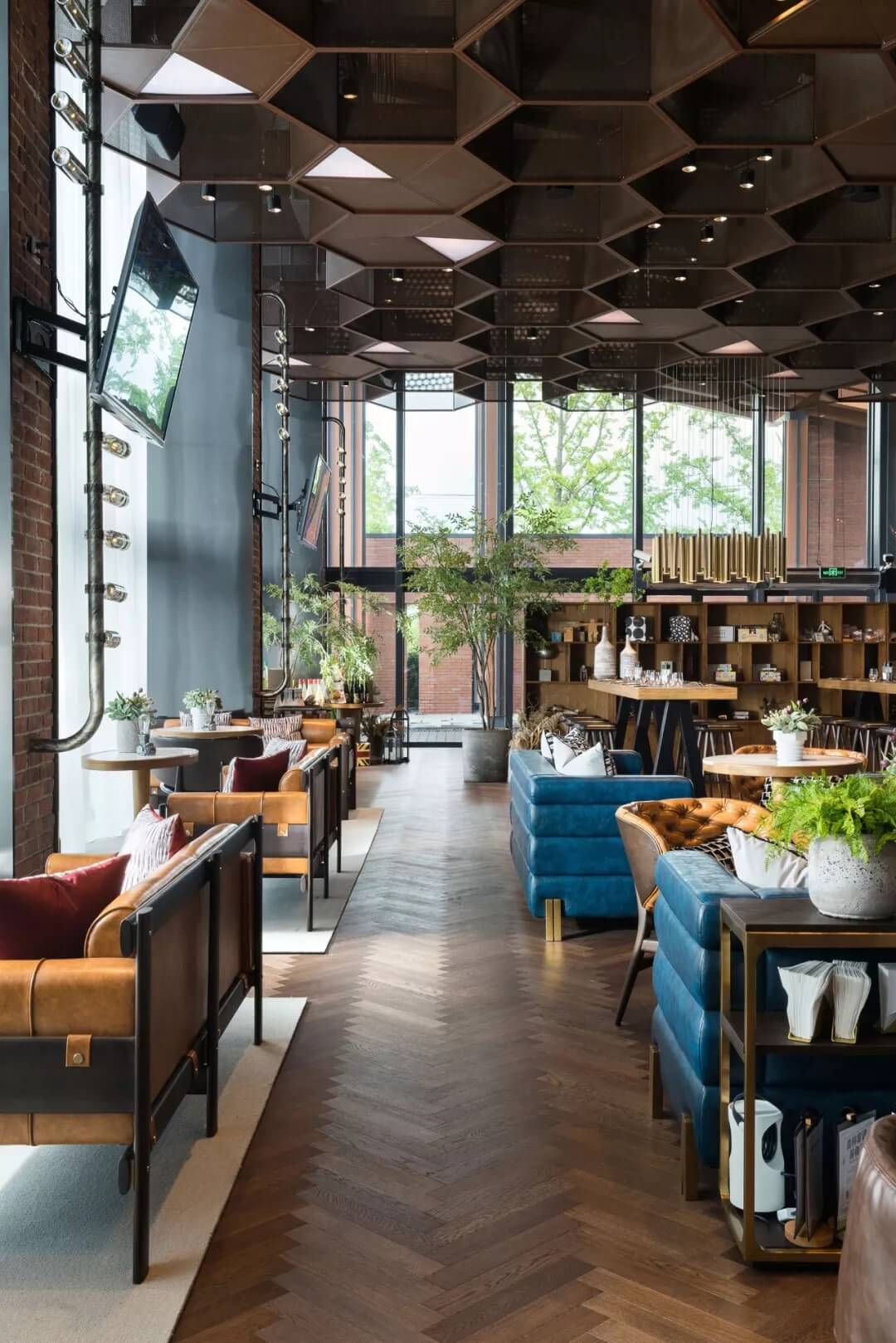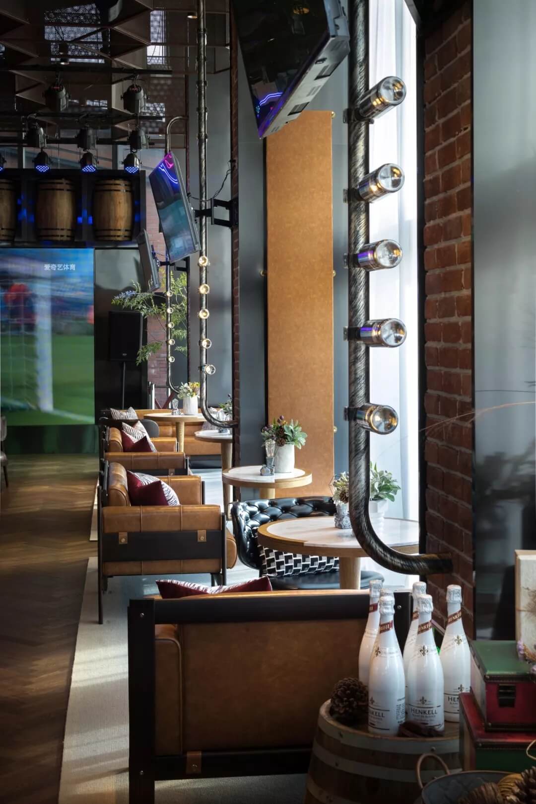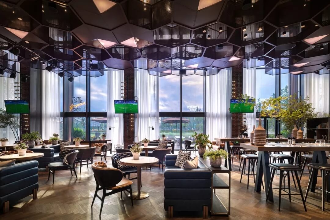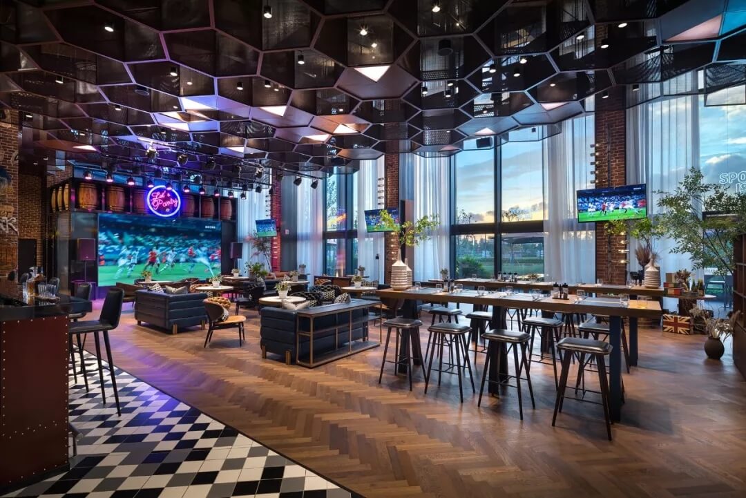 設計將足球的六邊形化用于天花的裝飾上,立體幾何的體量、金屬線條的質感賦予了社交空間的適當距離感。多幅大屏幕的配置,讓聚于此的人們,沉浸于啤酒吧和比賽現場的氛圍當中,盡情享受在開闊大氣的空間格局中觀摩賽事的自由,為熱愛喝彩,為夢想干杯,傳遞運動不止的精神。