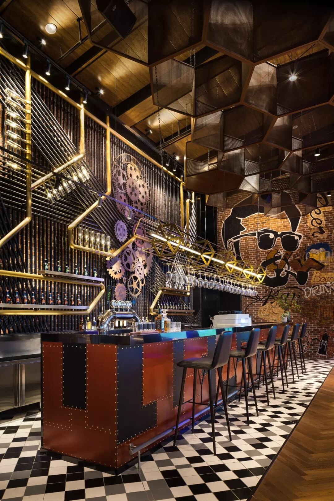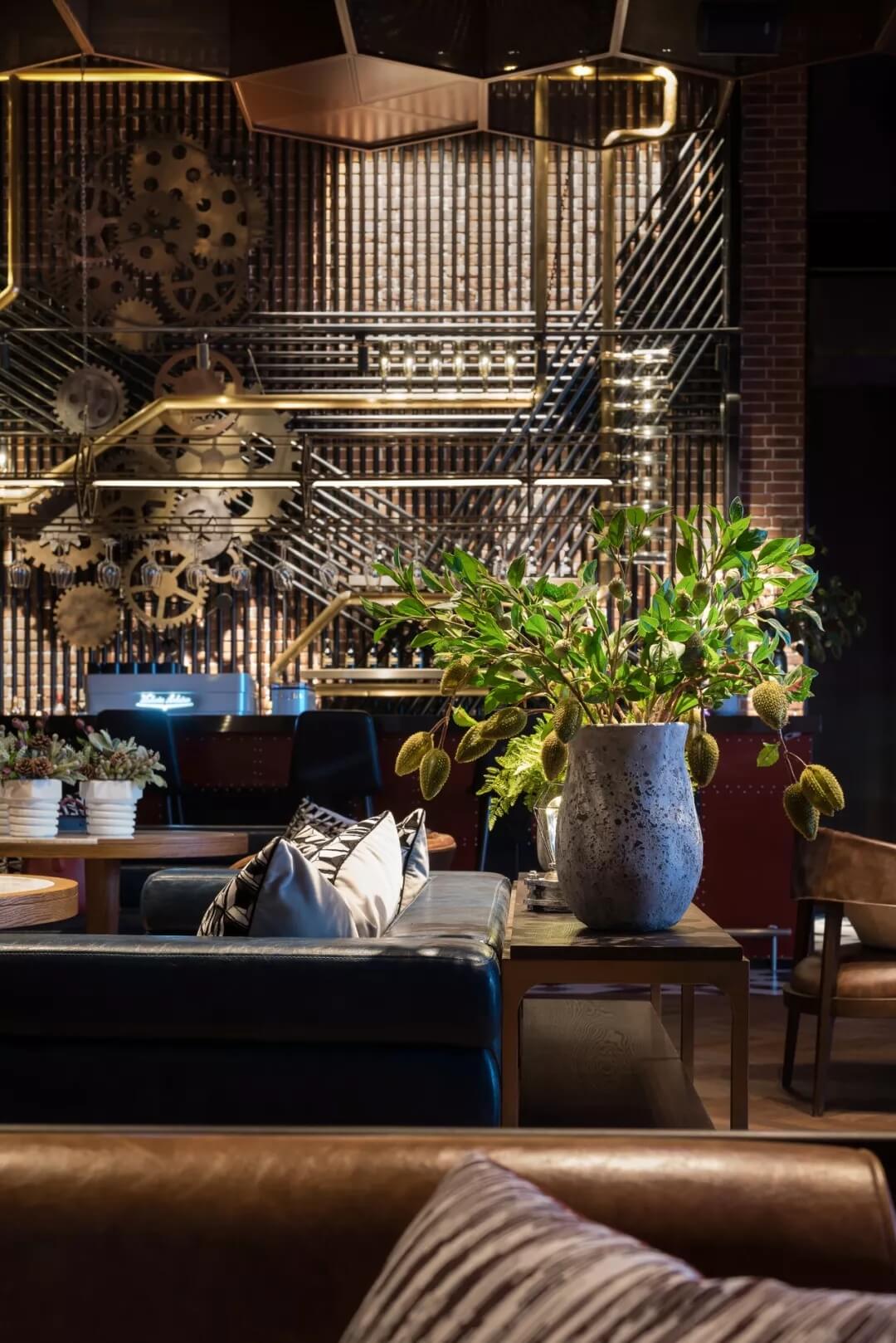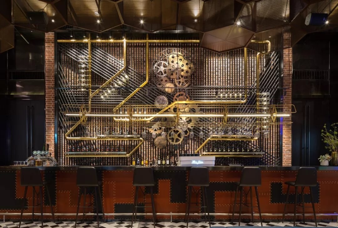 工業(yè)風的精髓在于,在原空間樸拙素簡的本真狀態(tài)下延展其自由隨性的氣質,在粗獷的空間架構中消解拘束感,呈現出大氣又不失細膩的美感。粗礪的紅磚墻、朋克夸張的墻畫涂鴉、裸露的管道線路、復古做舊的齒輪掛件、紅黑交接的鉚釘吧臺......統(tǒng)攝進工業(yè)風的設計常規(guī)之中。