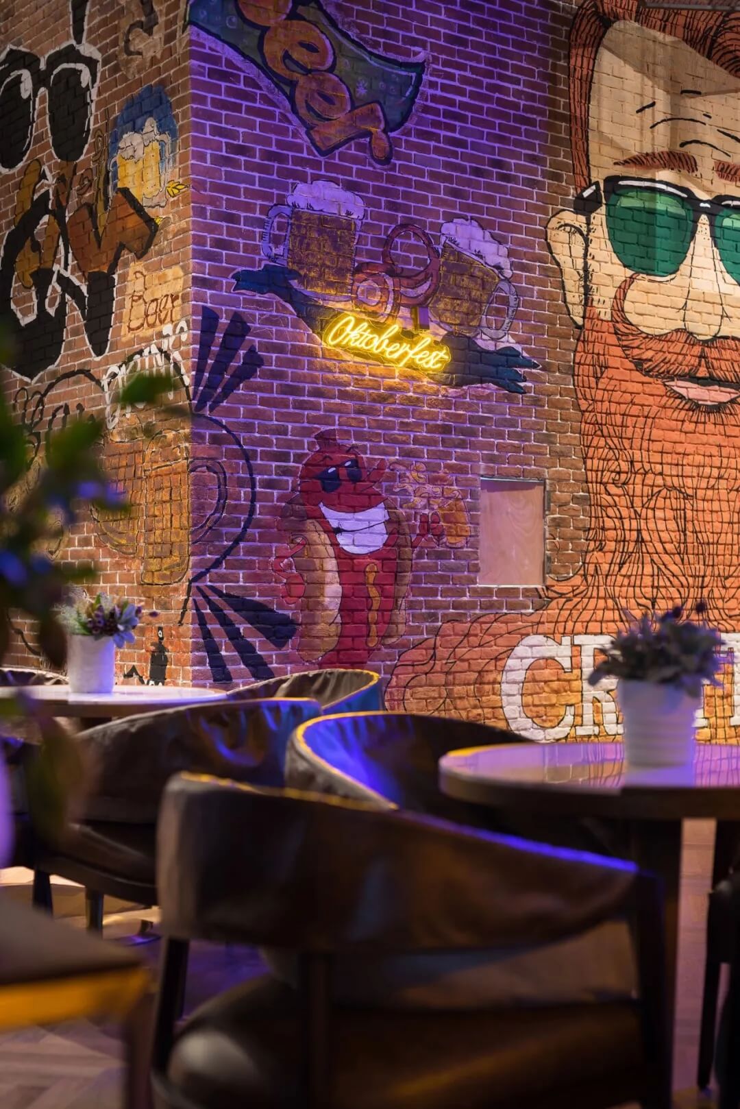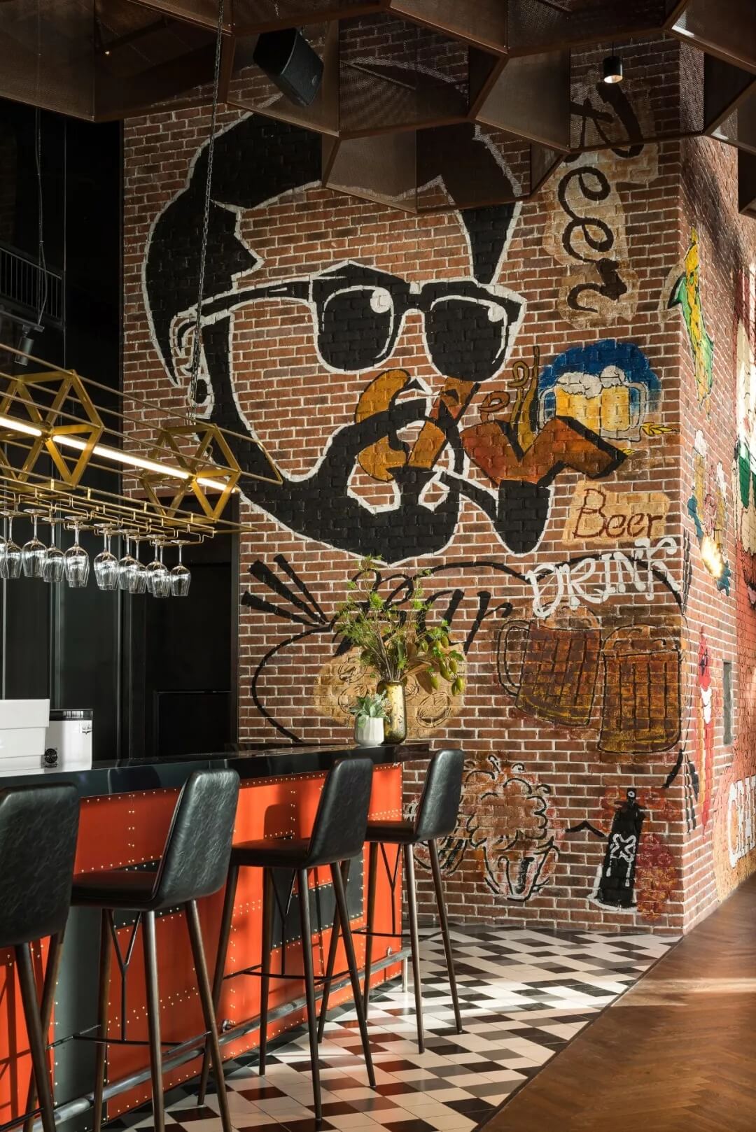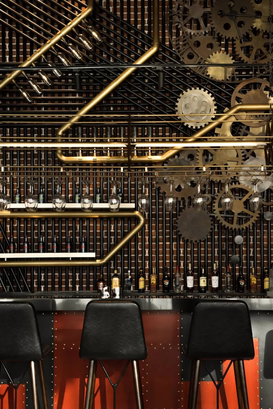 工業(yè)風的精髓在于,在原空間樸拙素簡的本真狀態(tài)下延展其自由隨性的氣質,在粗獷的空間架構中消解拘束感,呈現出大氣又不失細膩的美感。粗礪的紅磚墻、朋克夸張的墻畫涂鴉、裸露的管道線路、復古做舊的齒輪掛件、紅黑交接的鉚釘吧臺......統(tǒng)攝進工業(yè)風的設計常規(guī)之中。