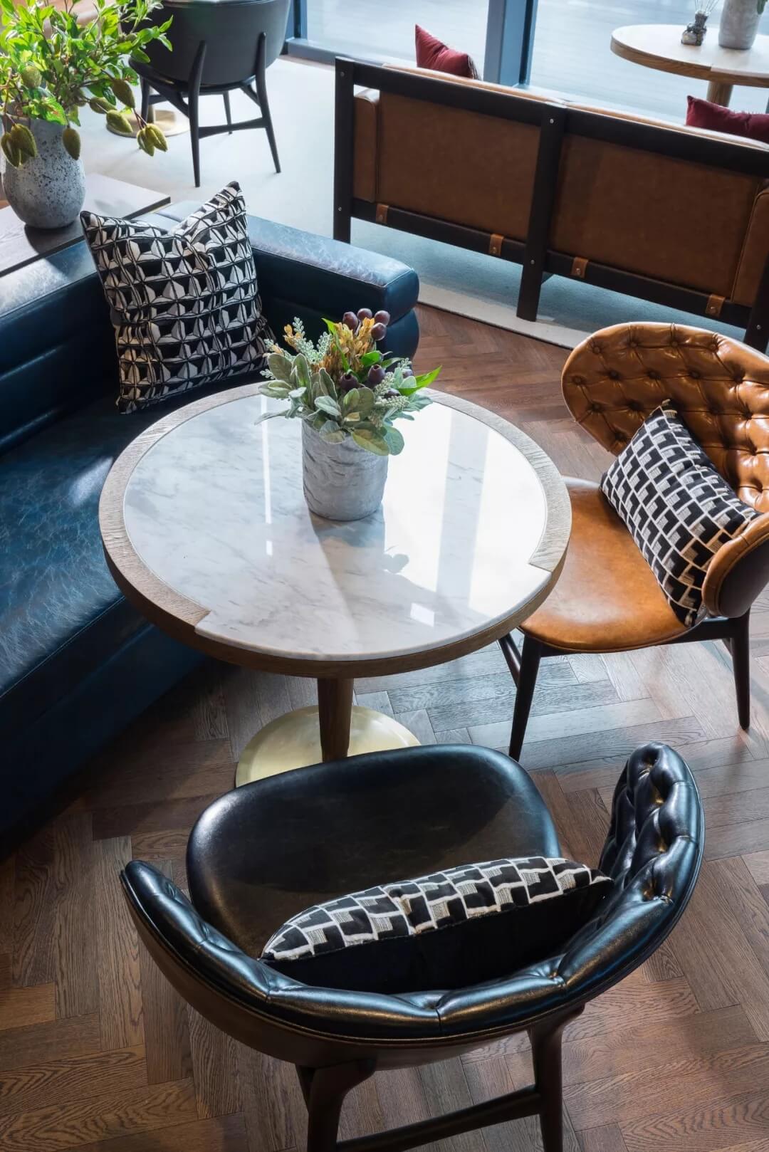 設計運用極簡的語言,打開空間與自然的悄聲對話,咖色的皮質沙發(fā)、幾處花藝、數個土陶裝飾,充盈著活力與生氣,人們置身此處,身心分外舒愜。
