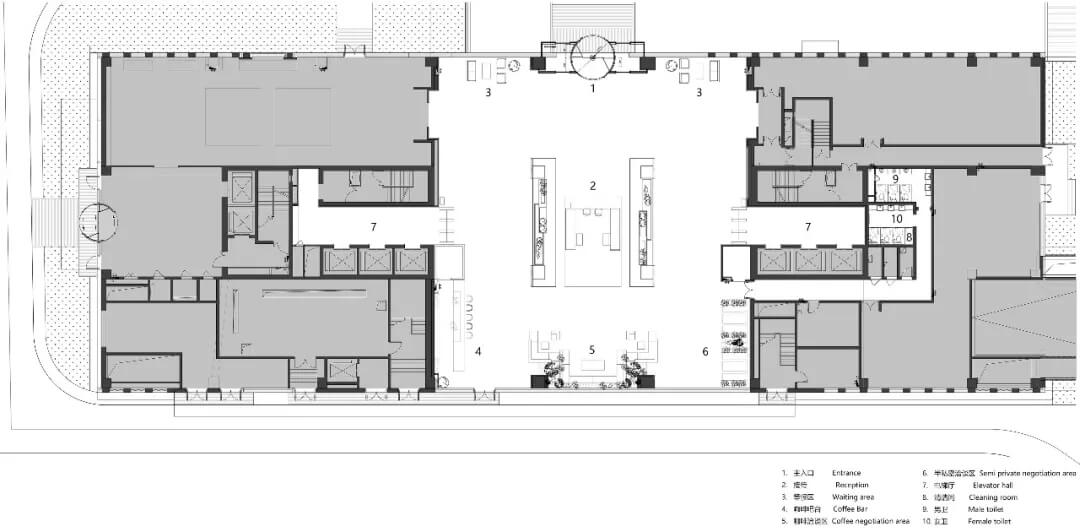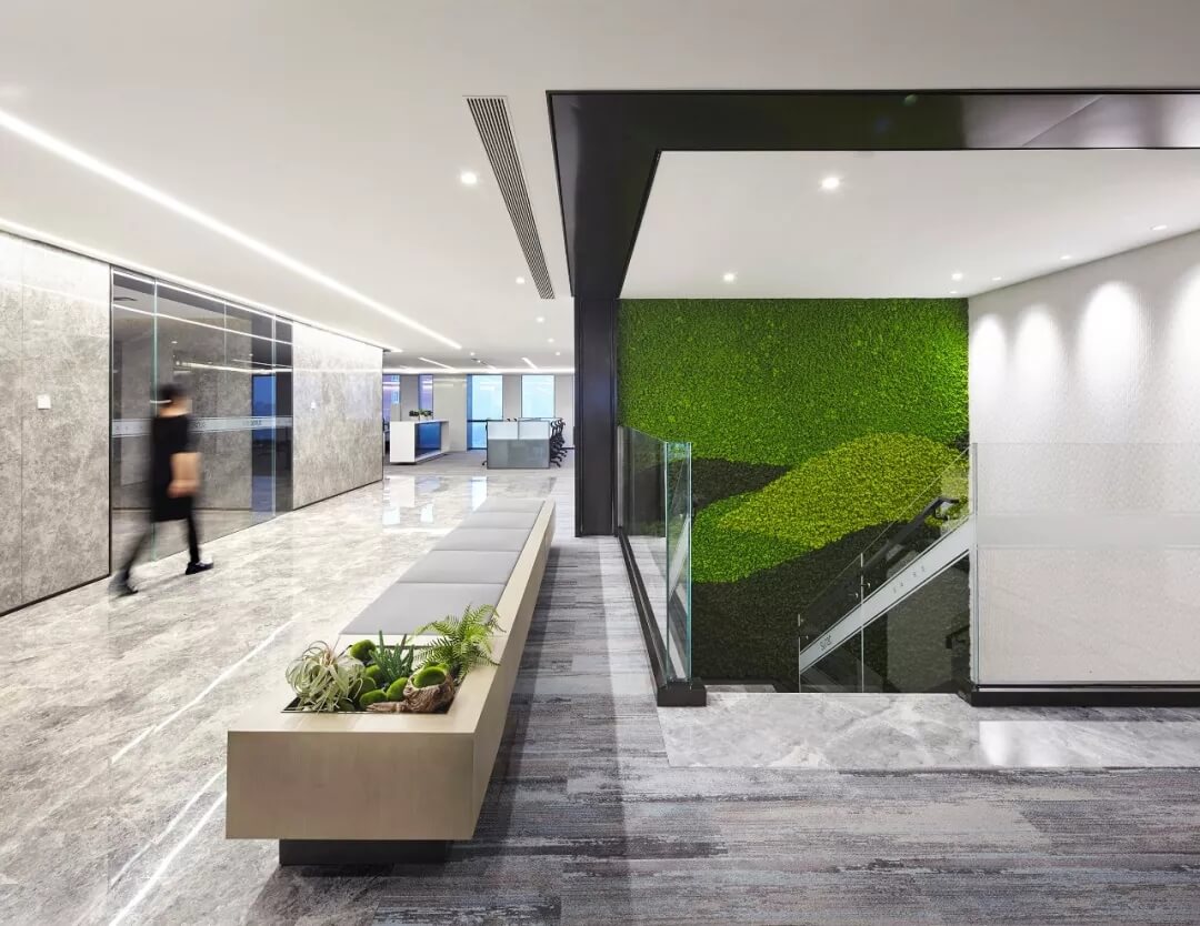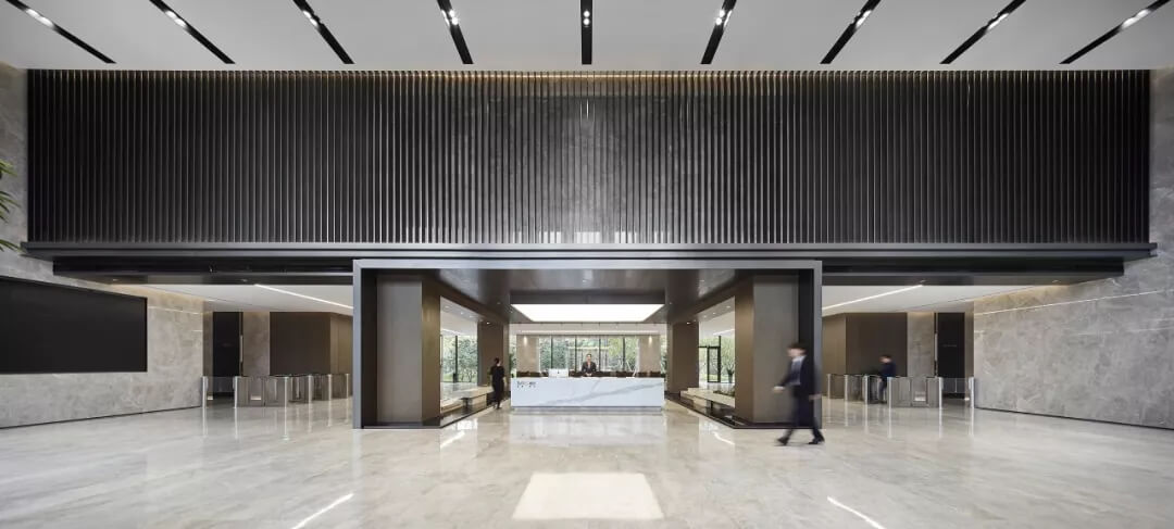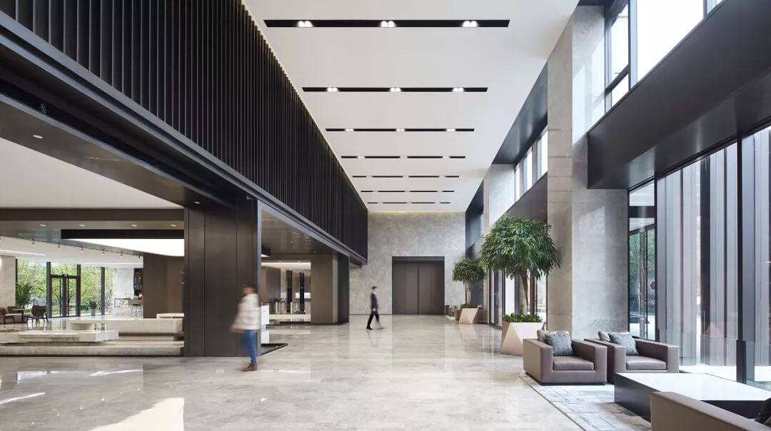 大堂是開放,通透,自然的園林式空間,自成一片天地。踏入大堂即可看到前廳接待島,方形四面通透的造型,嚴(yán)謹(jǐn)不失靈活,結(jié)合流動水景和盆景,營造了生態(tài)的,四季怡情的綠色辦公。電梯廳出入口在接待島兩側(cè),實(shí)現(xiàn)快速集散,避免上下班高峰期等候擁堵。咖啡等候區(qū)玻璃窗形成框景,把室外花園內(nèi)的四季變幻,自然元素都納入到室內(nèi)來,形成情景共融。