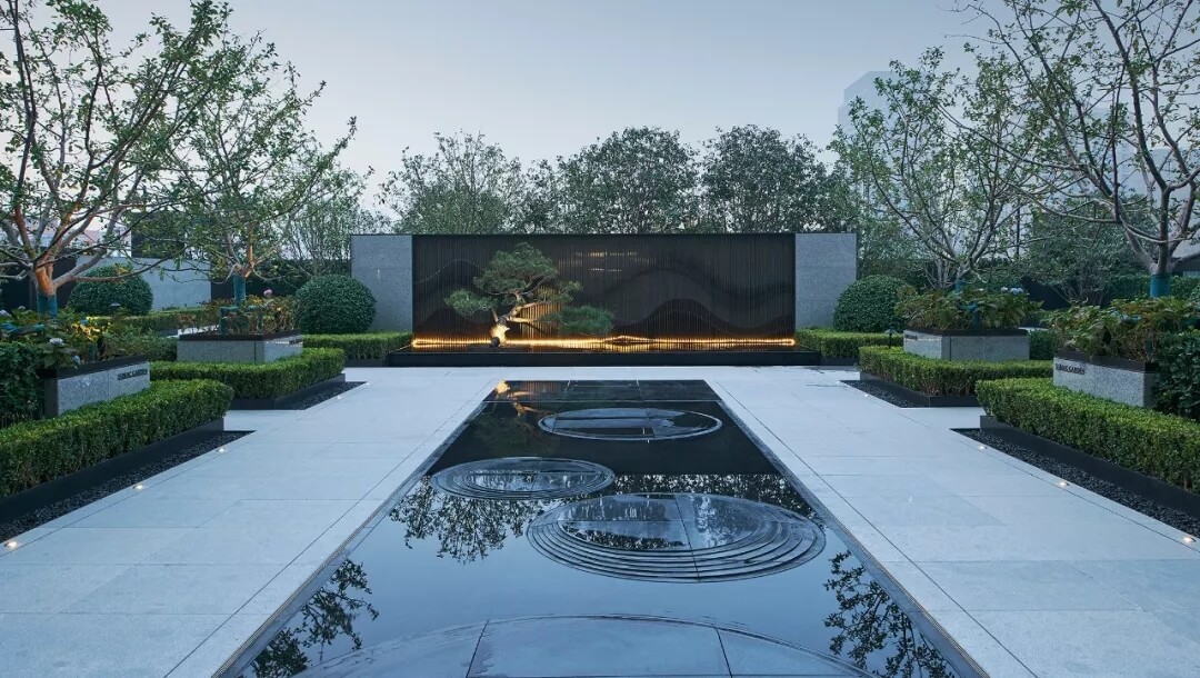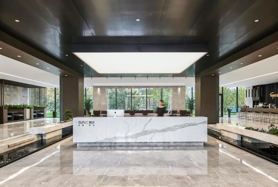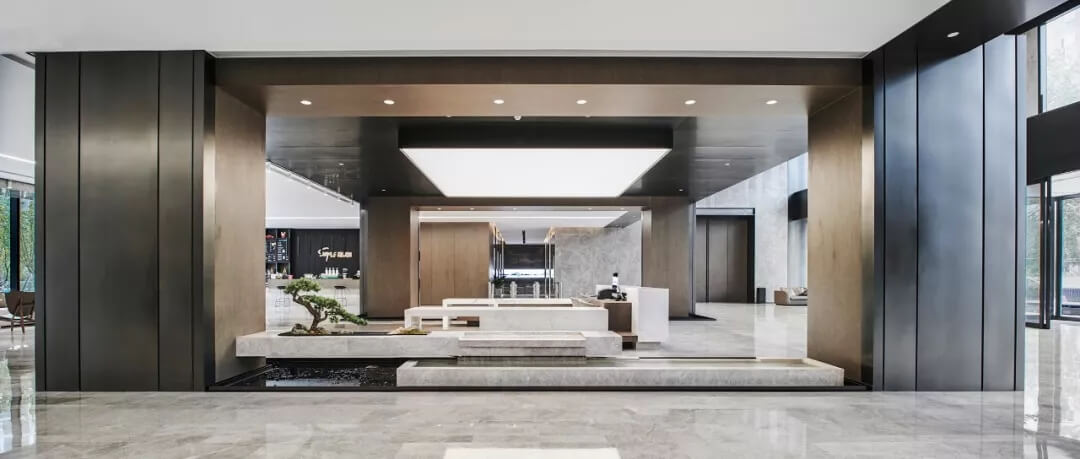 設(shè)計(jì)師通過空間布局,材料選用等營造出大堂沉靜務(wù)實(shí)、理性的空間氛圍,咖啡,水聲,盆景,窗外的花園,以及往來的員工,客戶和行人賦予這里靈魂和氣息,使整個(gè)大堂充滿各種可能性。