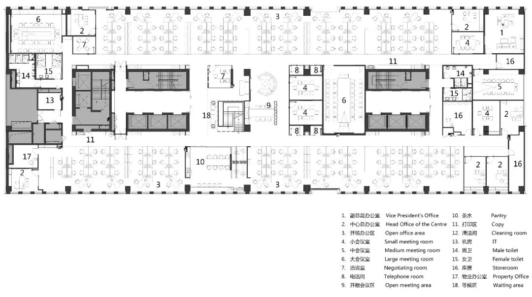 在空間規(guī)劃和功能布局上,兩側(cè)光線條件良好的區(qū)域設(shè)置開敞辦公區(qū);核心筒區(qū)增設(shè)存儲空間、電話間,洽談空間,會議室,滿足各種洽談會議需求;電梯集散口設(shè)置樓梯吹拔等候區(qū)、茶水區(qū)、景觀小品等開放共享和展示空間;采光較弱的中間區(qū)域,插入玻璃盒子做會議室。整個(gè)平面布局,在原建筑條件基礎(chǔ)上,融合融創(chuàng)需求,級級遞進(jìn),相互銜接。