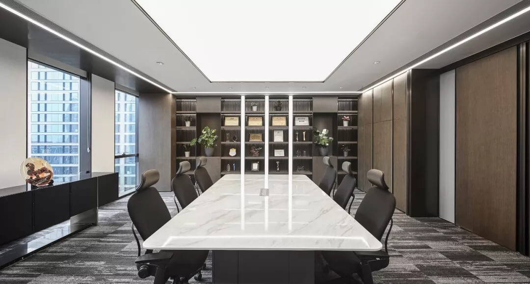 設(shè)計(jì)師綜合融創(chuàng)的不同會議使用訴求以及原建筑結(jié)構(gòu),在空間布局上,打造核心筒混合會議帶,不同大小、不同形式的會議空間嵌套在每層開放辦公區(qū)的不同位置,滿足多元化會議需求;卡座,開敞洽談區(qū),休閑洽談區(qū)滿足互動交流,頭腦風(fēng)暴式會議需求。多層次多功能的交流會議由智能系統(tǒng)高效管理,體現(xiàn)融創(chuàng)開放、包容的企業(yè)文化。