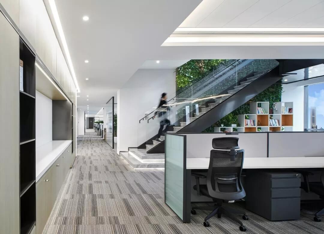 步梯采用極簡折轉(zhuǎn)的造型和玻璃材質(zhì),每層的樓梯區(qū)結(jié)合景觀設(shè)計(jì),聯(lián)通電梯入口,茶水間,設(shè)置景觀小品,圖書閱讀空間,洽談卡座,等候區(qū)等,形成辦公空間的共享交流區(qū)和創(chuàng)意生活區(qū),打造有活力,展示性強(qiáng)的員工休閑活動區(qū)。