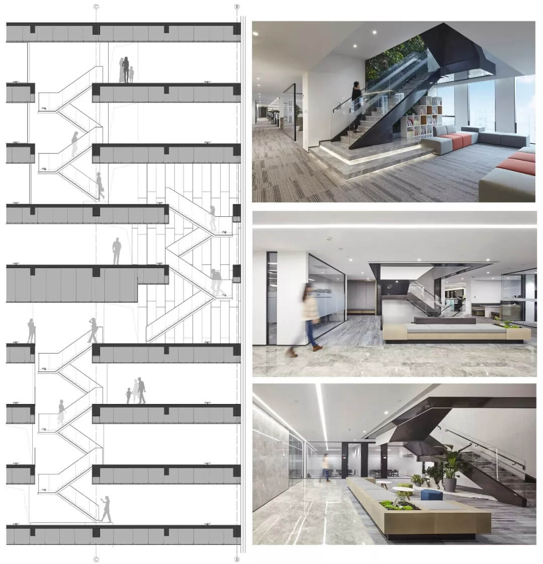 4-11層打通局部樓板增設(shè)步梯,增加吹拔空間,巧妙的貫通上下層空間,加速空氣流通,使空間更加靈動透氣,減少空調(diào)使用量,同時(shí)也使各部門聯(lián)系更便捷,溝通更高效 。