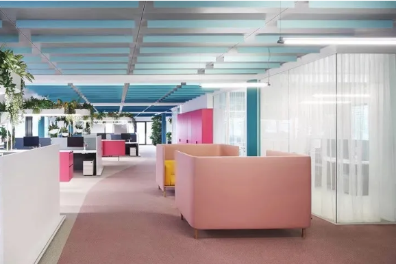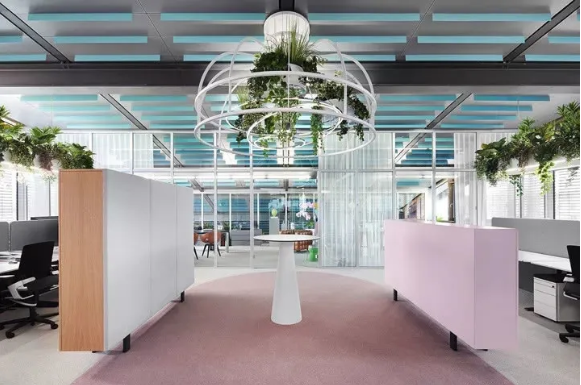 工作區(qū)采用中性色設(shè)計(jì),利于專(zhuān)注工作。淡粉色的走道是真正的情緒助推器,它喚起了員工之間的情感共鳴。精心布置的水源和雅致的燈光設(shè)計(jì)有助于帶來(lái)更愉悅的心情。熱帶壁紙與柔軟的沙發(fā)和小圓桌塑造了一個(gè)熱情洋溢的活力氛圍。