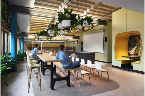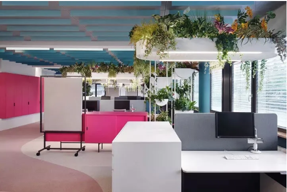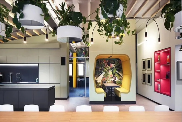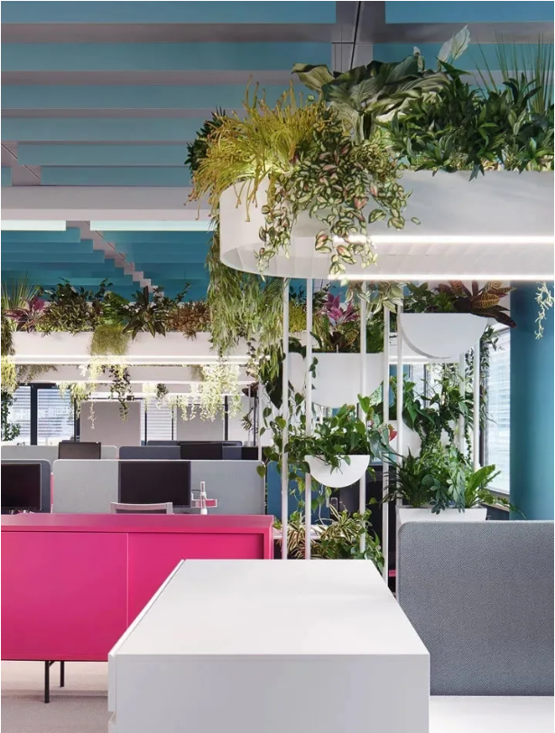 首先,設(shè)計(jì)團(tuán)隊(duì)為這處工作場(chǎng)所增添了2100個(gè)超級(jí)盆栽植物。綠植能產(chǎn)生良好的情緒、降低精神壓力、促進(jìn)創(chuàng)新、提高績(jī)效。此外,綠植還能改善空氣質(zhì)量、營(yíng)造健康環(huán)境,并起到降噪的作用。它們只需定期澆水就能保持茂盛狀態(tài),因此深得人心。室內(nèi)盆栽植物具有強(qiáng)大的正能量。自從加入了這些綠化,室內(nèi)濕度不僅從18%增加到44%,讓人們的體感非常舒適,連員工的病假都減少了一半!