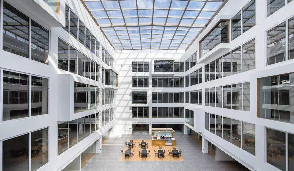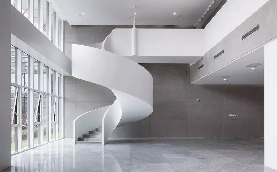 從中庭的自然光到室內(nèi)的人工光,大廈的光影在豁然開(kāi)朗和細(xì)致入微之中不斷變換。中庭必須和天空有所交流,尤其是霧霾肆虐的今天,藍(lán)天顯得特別稀有,在中庭上方加蓋玻璃幕墻為上策。流空素影正翩翻,使得存在于強(qiáng)烈靜態(tài)空間體驗(yàn)中的人又能同時(shí)感受到光影與云卷云舒的動(dòng)態(tài)變化。在典型的辦公樓層,小型私人會(huì)議室從中庭立面懸挑而出,并錯(cuò)落有致,打破了中庭的單調(diào),并增加了最小辦公空間的面積。一側(cè)的螺旋樓梯飄逸靈動(dòng),用混凝土演繹出的獨(dú)特輕薄感如風(fēng)裳皎立,引辦公的人們靈感興發(fā)。