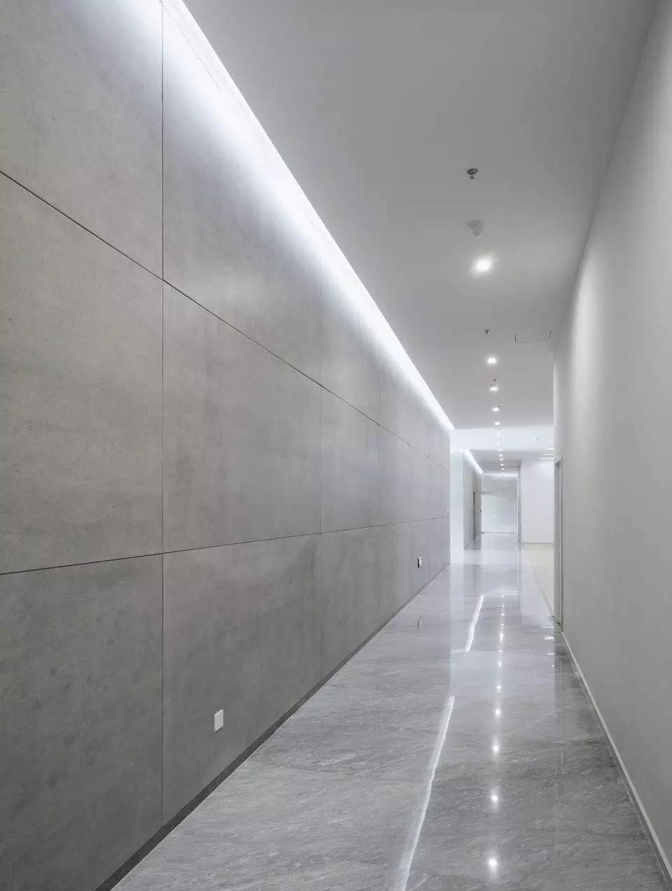 不同的空間內(nèi)容對(duì)應(yīng)不同的材質(zhì)氛圍,從色彩到質(zhì)感,再到意象化的裝飾,我們依據(jù)大堂、會(huì)議、休息室、中庭等不同空間尺度與空間內(nèi)容營(yíng)造新穎豐富、恰如其分的空間氛圍。溫暖的木色、混凝土板、白色大理石和白色乳膠漆為主要材料,其中報(bào)告廳大異其趣,優(yōu)雅高貴的深灰色布藝軟包與報(bào)告廳的相對(duì)集中和封閉性相得益彰。我們依托原有建筑空間序列,如大堂-電梯廳-等候區(qū)-多功能廳-VIP室-展廳,調(diào)整改變室內(nèi)設(shè)計(jì)的溫度與濃度,為原本純功能理性化的空間組織蒙上一層魅力面紗,讓功能化的“經(jīng)過(guò)”變?yōu)橐淮尾簧岬鸟v留與感受。