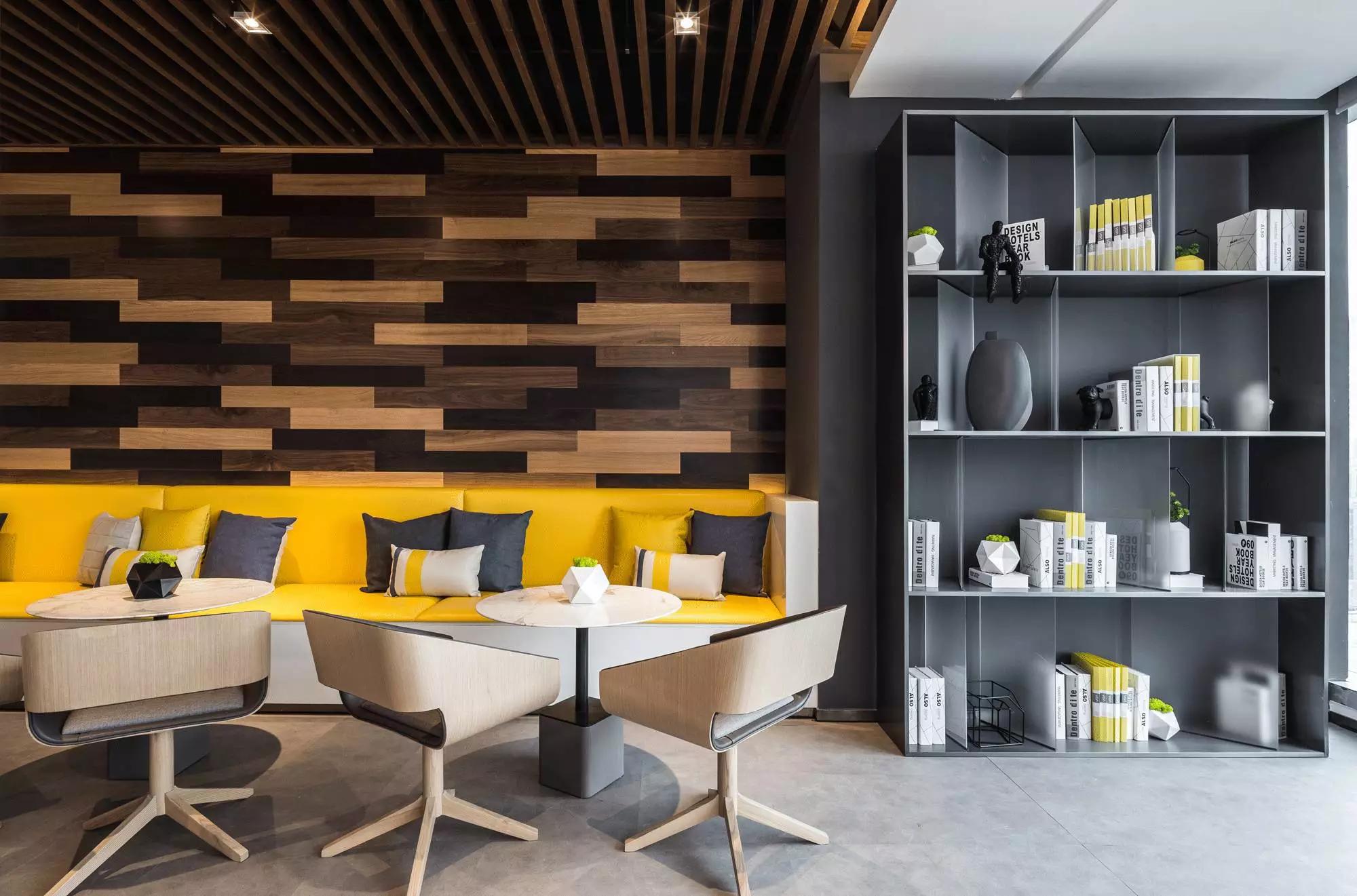 設(shè)計(jì)師用藍(lán)與灰搭配出冷靜主色調(diào),綴以沙發(fā)的暖意來提亮空間,而背景以深淺原木交錯(cuò)搭配,設(shè)計(jì)流于細(xì)節(jié)之中。閑時(shí),或仰臥在沙發(fā)上、在其旁邊的書柜看一會(huì)兒閑書,或坐在沙發(fā)上與同事聊聊天、聽一段舒緩的音樂、下一盤棋,小憩之后再投入工作,想必效率也會(huì)更高。
