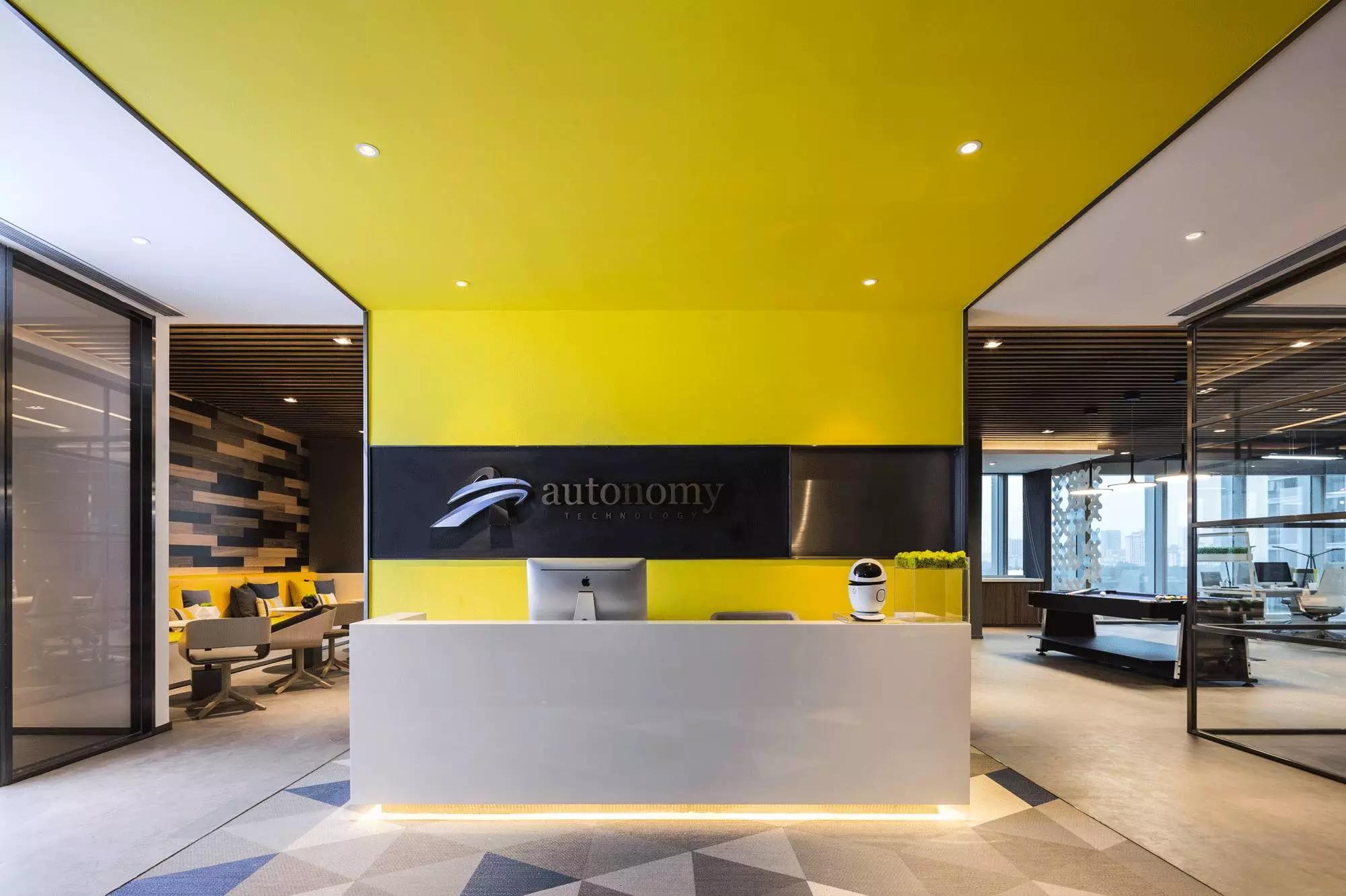 入口,一抹明亮的暖黃尤其奪目,且從背景墻開始延伸、直至天花,渲染了科技感,反差較大的色彩搭配給眼睛帶來強(qiáng)烈的視覺沖擊,一眼便能望見“autonomy”,點(diǎn)明主題。