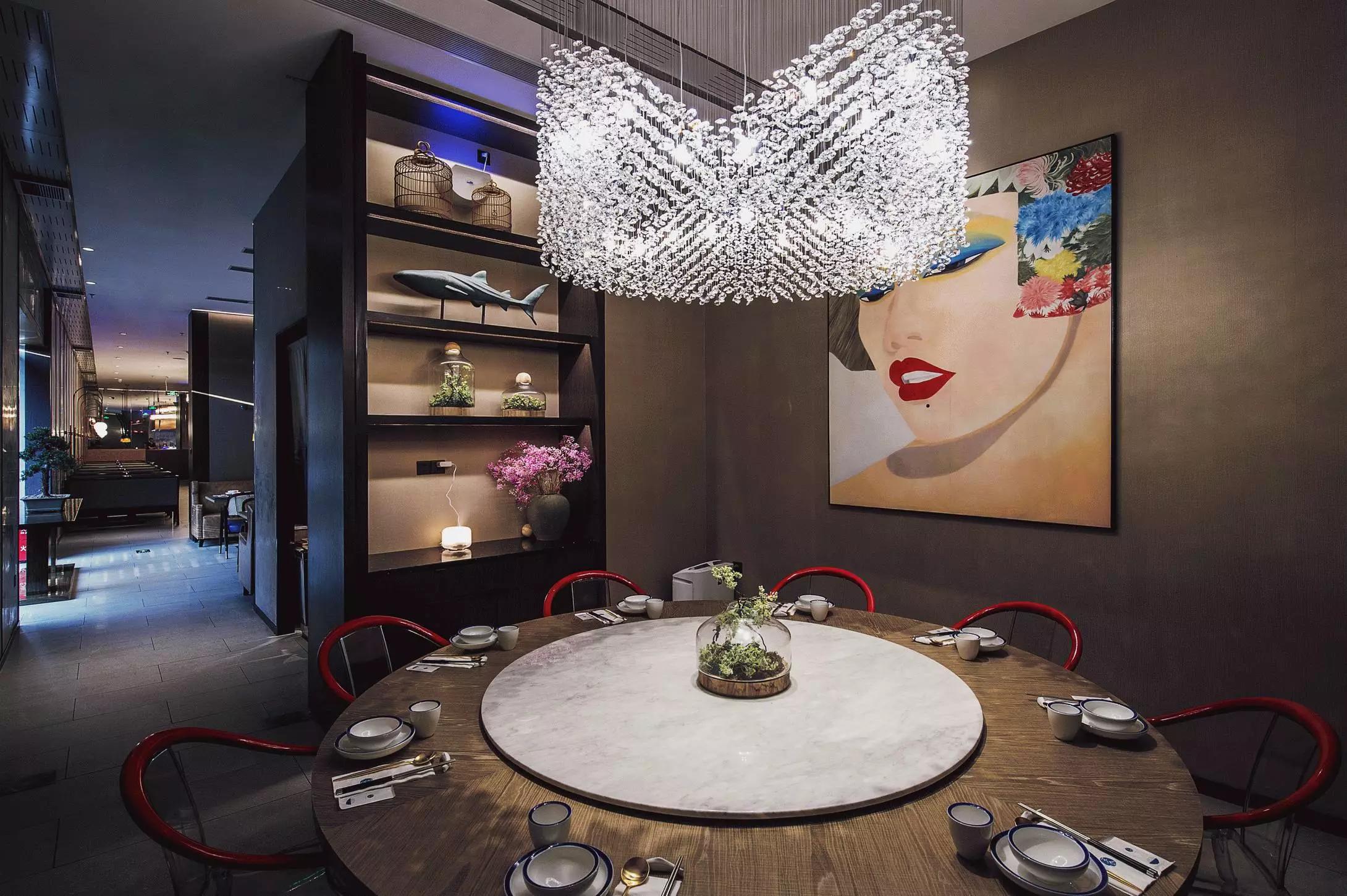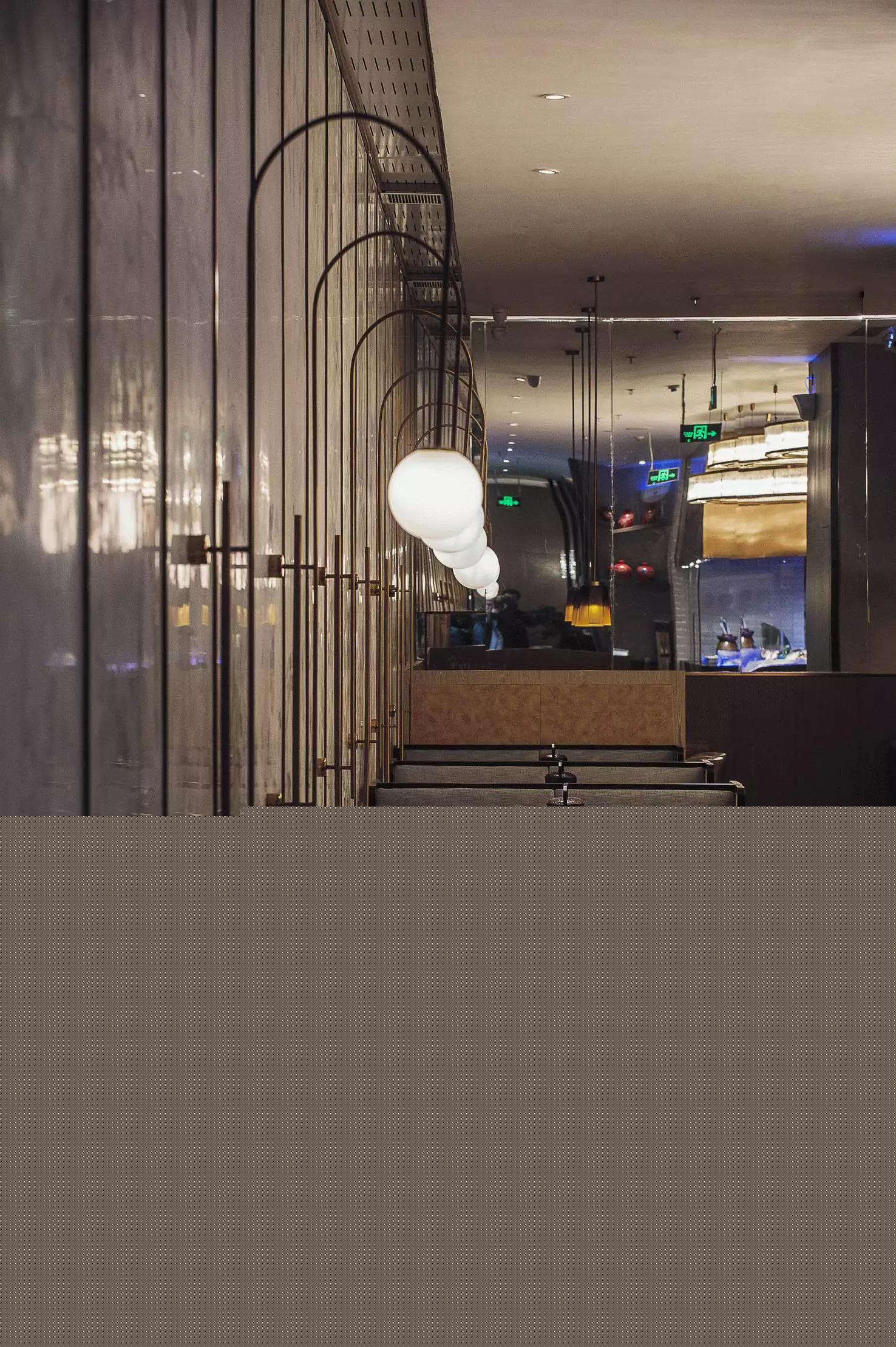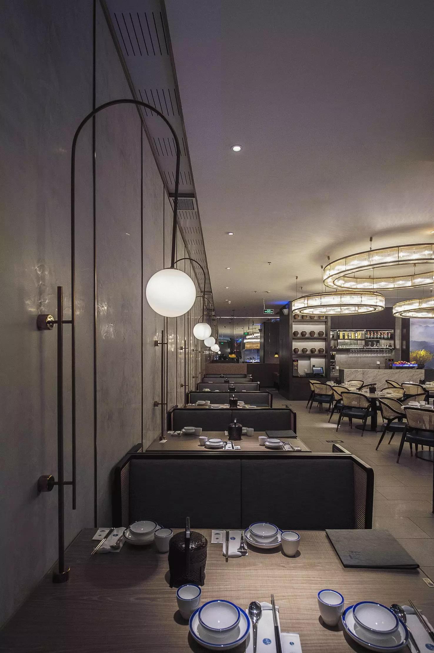 用餐區(qū)完全是一個開放的空間,沒有很多的隔斷,圓桌和方桌有序排布,既充分利用了空間又避免了單調(diào),結(jié)合燈具的設(shè)計,就像在老家庭院里的大家庭聚餐——夜晚,歸來的親人們,在清涼的月色中,你來我往,和和樂樂,傳遞此間。