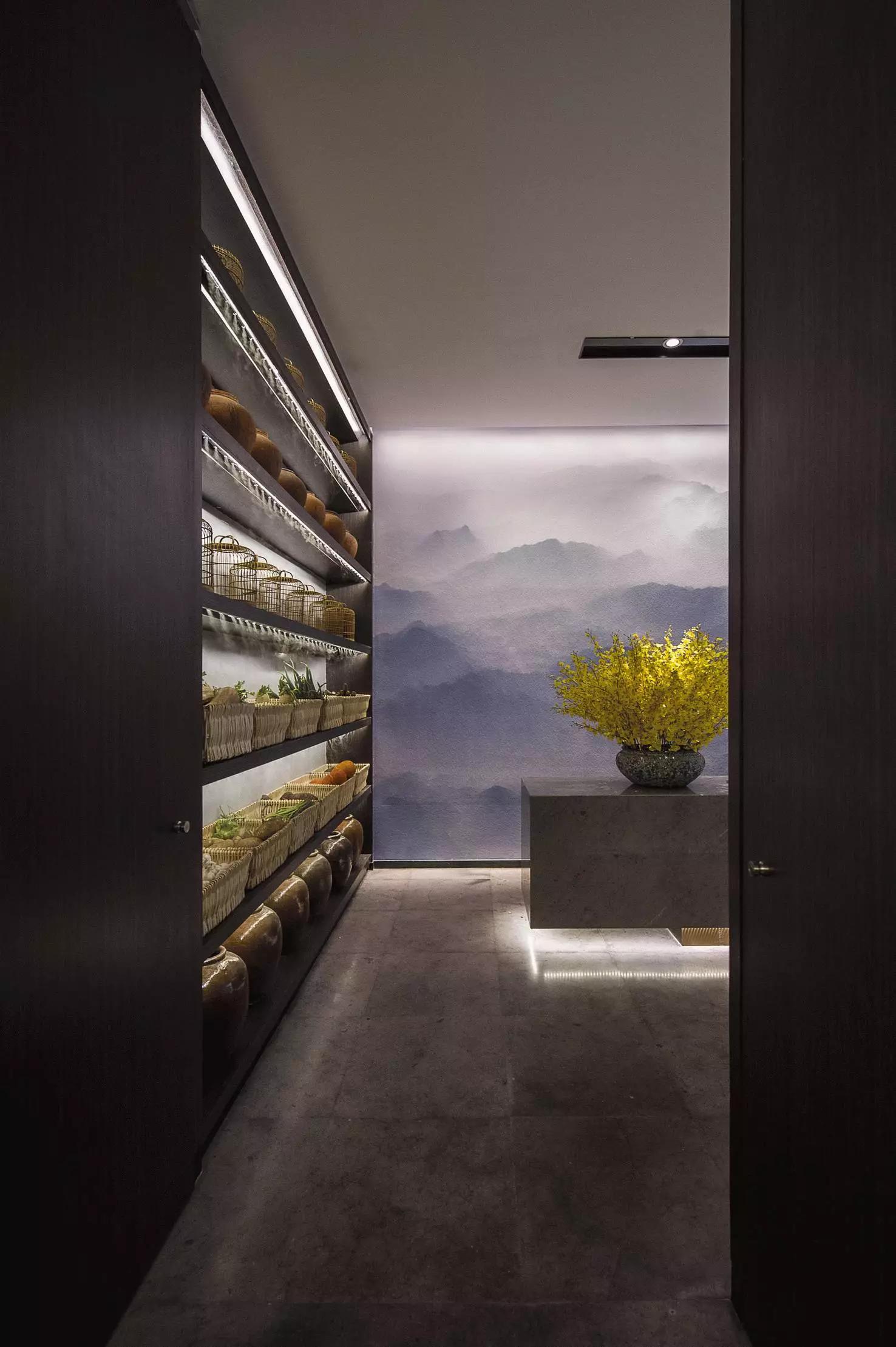 玻璃隔斷上的貼膜,在燈光的作用下恰似雕花窗欞,與另一邊的壁畫一虛一實(shí)相映成趣。氤氳的群山壁畫,勾起對山海那邊,永遠(yuǎn)的家的思念。
