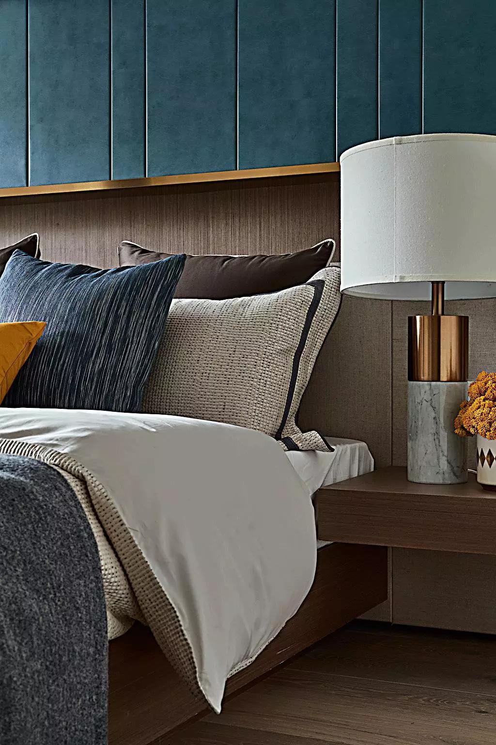 主臥,色彩沉穩(wěn)不失活力,黃銅和皮革造就空間的質感,也如同雅痞們的堅毅果敢、躊躇滿志。他們沒有頹廢情緒,一心追求奢侈舒適的生活。